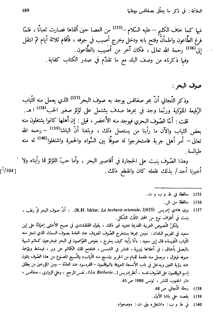 (¬137) يرى هادي إدريس (R. H. Idriss: La berberie orientale, 2/ 635) ، أنّ صوف البحر قزّ رطب، ينبت في أطراف نوع من المحار المثلّث الشّكل. ولكنّ النّصوص العربية القديمة تعتبره غير ذلك، يقول القلقشندي في صبح الأعشى إعتمادا على إبن سعيد في تقويم البلدان: «ومن بحرها يستخرج الصّوف المعروف عند العامة بصوف السمك الذي تنجز منه الثّياب النّفيسة» قال إبن سعيد: «أنا رأيته كيف يخرج، يغوص الغوّاصون في البحر فيخرجون كمائم شبيهة بالبصل بأعناق، في أعلاها زويرة، فتنشر في الشمس، فتنفتح تلك الكمائم عن وبر، فيمشط ويؤخذ صوفه فيغزل، ويعمل منه طعمة لقيام من الحرير وتنسج منه الثّياب» والنّسيج المصنوع من هذا الصّوف يتلون عند رؤية العين ويدخل في باب الأنسجة المعروفة بالبوقلمون - القرمسود عند العامّة - ومن المؤرخين من يطلق إسم البوقلمون على الصّوف نفسه، أنظر إدريس (La Berberie) ، نفس المرجع، وعلي الزواري، صفاقس، دار الجنوب للنشر، تونس 1980 ص: 63.