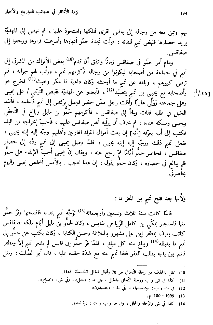 فلمّا كانت سنة ثلاث وتسعين وأربعمائة (¬13) توجّه تميم بنفسه فافتتحها وفرّ حمّو منها فاستجار يمكّي بن كامل الرّياحي بقابس، وكان لحمّو بن مليل أيّام ملكه لصفاقس كاتب يعرف بمظفر إبن علي مشهور بالبلاغة وحسن الكتابة، وكان يكتب عن حمّو إلى تميم ما يغيظه (¬14) ويبلغ منه كل مبلغ، فلمّا فرّ حمّو إلى قابس لم يشعر تميم إلاّ ومظفر قائم بين يديه يطلب العفو فعفا تميم عنه مع شدّة حقده عليه، قال أبو الصّلت: ومثل
