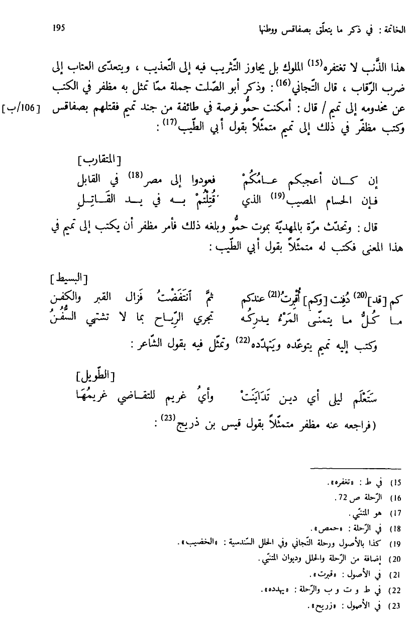 هذا الذّنب لا تغتفره (¬15) الملوك بل يجاوز التّثريب فيه إلى التّعذيب، ويتعدّى العتاب إلى ضرب الرّقاب، قال التّجاني (¬16): وذكر أبو الصّلت جملة ممّا تمثل به مظفر في الكتب عن مخدومه إلى تميم / قال: أمكنت حمّو فرصة في طائفة من جند تميم فقتلهم بصفاقس وكتب مظفّر في ذلك إلى تميم متمثّلا بقول أبي الطّيب (¬17):