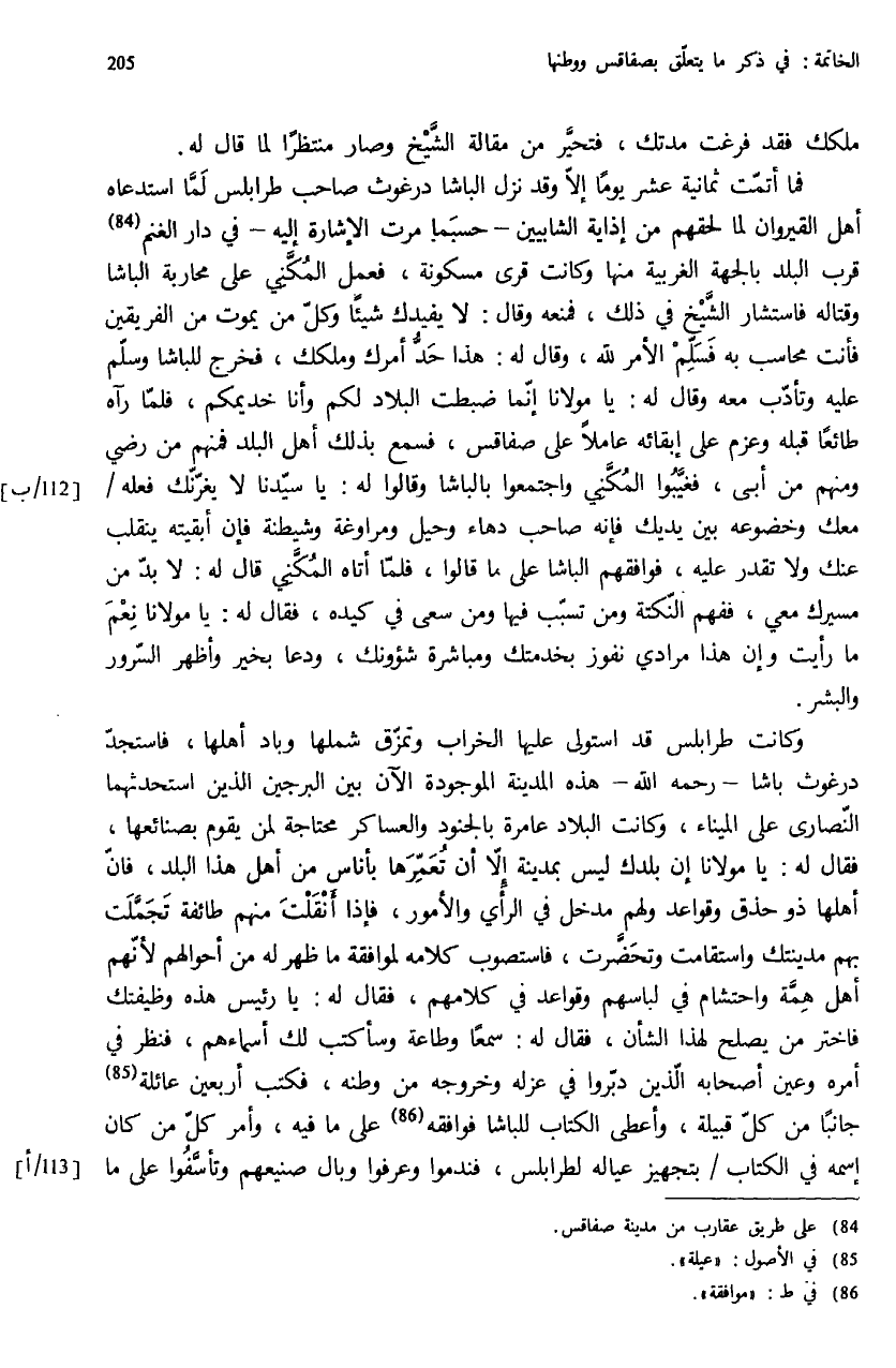 وكانت طرابلس قد استولى عليها الخراب وتمزّق شملها وباد أهلها، فاستجدّ درغوث باشا - رحمه الله - هذه المدينة الموجودة الآن بين البرجين الذين استحدثهما النّصارى على الميناء، وكانت البلاد عامرة بالجنود والعساكر محتاجة لمن يقوم بصنائعها، فقال له: يا مولانا إن بلدك ليس بمدينة إلاّ أن تعمّرها بأناس من أهل هذا البلد، فانّ أهلها ذو حذق وقواعد ولهم مدخل في الرأي والأمور، فإذا أنقلت منهم طائفة تجمّلت بهم مدينتك واستقامت وتحضّرت، فاستصوب كلامه لموافقة ما ظهر له من أحوالهم لأنّهم أهل همّة واحتشام في لباسهم وقواعد في كلامهم، فقال له: يا رئيس هذه وظيفتك فاختر من يصلح لهذا الشأن، فقال له: سمعا وطاعة وسأكتب لك أسماءهم، فنظر في أمره وعين أصحابه الّذين دبّروا في عزله وخروجه من وطنه، فكتب أربعين عائلة (¬85) جانبا من كلّ قبيلة، وأعطى الكتاب للباشا فوافقه (¬86) على ما فيه، وأمر كلّ من كان إسمه في الكتاب / بتجهيز عياله لطرابلس، فندموا وعرفوا وبال صنيعهم وتأسّفوا على ما