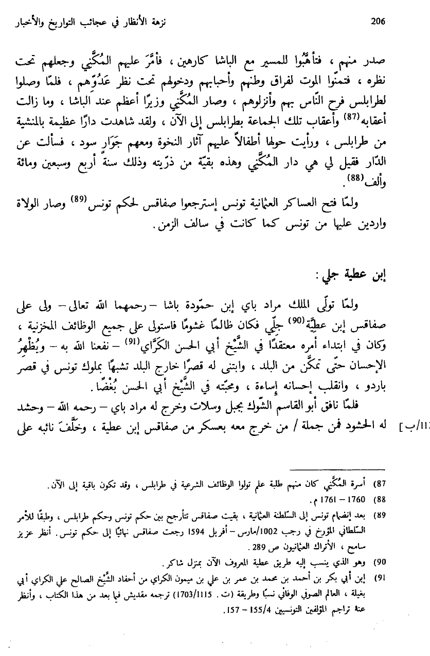 صدر منهم، فتأهّبوا للمسير مع الباشا كارهين، فأمّر عليهم المكّني وجعلهم تحت نظره، فتمنّوا الموت لفراق وطنهم وأحبابهم ودخولهم تحت نظر عدوّهم، فلمّا وصلوا لطرابلس فرح النّاس بهم وأنزلوهم، وصار المكّني وزيرا أعظم عند الباشا، وما زالت أعقابه (¬87) وأعقاب تلك الجماعة بطرابلس إلى الآن، ولقد شاهدت دارا عظيمة بالمنشية من طرابلس، ورأيت حولها أطفالا عليهم آثار النخوة ومعهم جوار سود، فسألت عن الدّار فقيل لي هي دار المكّني وهذه بقيّة من ذرّيته وذلك سنة أربع وسبعين ومائة وألف (¬88).
