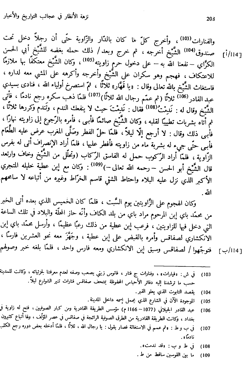 (¬106) عبد القادر الجيلاني (1077 - 1166 م) مؤسس الطريقة القادرية ومن كبار الصوفيين، فتح له زاوية في بغداد، وكانت الطريقة القادرية من الطرق الصوفية الرائجة في صفاقس في عصر المؤلّف، ولها أتباع كثيرون.