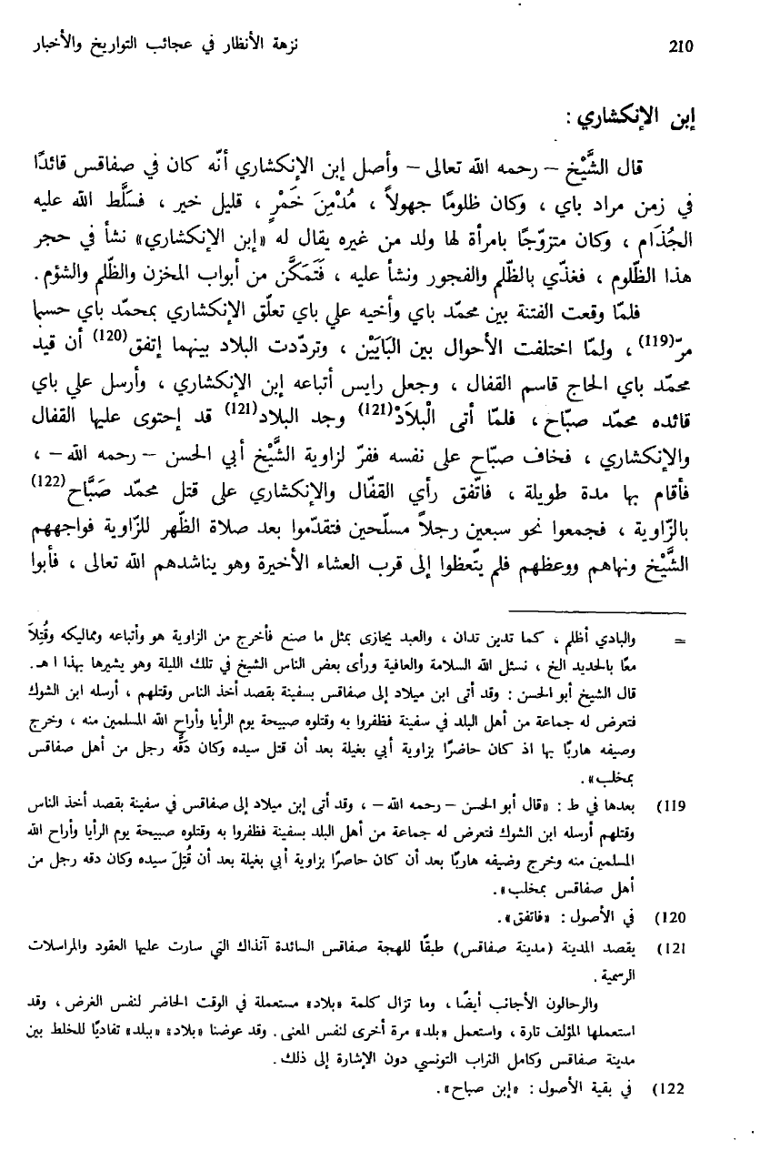(¬121) يقصد المدينة (مدينة صفاقس) طبقا للهجة صفاقس السائدة آنذاك التي سارت عليها العقود والمراسلات الرسمية. والرحالون الأجانب أيضا، وما تزال كلمة «بلاد» مستعملة في الوقت الحاضر لنفس الغرض، وقد استعملها المؤلف تارة، واستعمل «بلد» مرة أخرى لنفس المعنى. وقد عوضنا «بلاد» «ببلد» تفاديا للخلط بين مدينة صفاقس وكامل التراب التونسي دون الإشارة إلى ذلك.