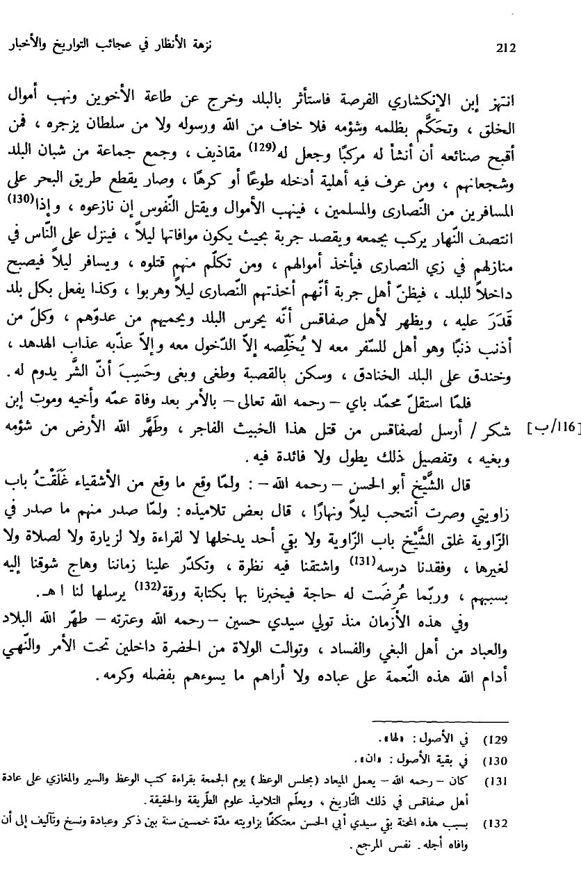 انتهز إبن الإنكشاري الفرصة فاستأثر بالبلد وخرج عن طاعة الأخوين ونهب أموال الخلق، وتحكّم بظلمه وشؤمه فلا خاف من الله ورسوله ولا من سلطان يزجره، فمن أقبح صنائعه أن أنشأ له مركبا وجعل له (¬129) مقاذيف، وجمع جماعة من شبان البلد وشجعانهم، ومن عرف فيه أهلية أدخله طوعا أو كرها، وصار يقطع طريق البحر على المسافرين من النّصارى والمسلمين، فينهب الأموال ويقتل النّفوس إن نازعوه، وإذا (¬130) انتصف النّهار يركب بجمعه ويقصد جربة بحيث يكون موافاتها ليلا، فينزل على النّاس في منازلهم في زي النصارى فيأخذ أموالهم، ومن تكلّم منهم قتلوه، ويسافر ليلا فيصبح داخلا للبلد، فيظنّ أهل جربة أنّهم أخذتهم النّصارى ليلا وهربوا، وكذا يفعل بكل بلد قدر عليه، ويظهر لأهل صفاقس أنّه يحرس البلد ويحميهم من عدوّهم، وكلّ من أذنب ذنبا وهو أهل للسّفر معه لا يخلّصه إلاّ الدّخول معه وإلاّ عذّبه عذاب الهدهد، وخندق على البلد الخنادق، وسكن بالقصبة وطغى وبغى وحسب أنّ الشّر يدوم له.