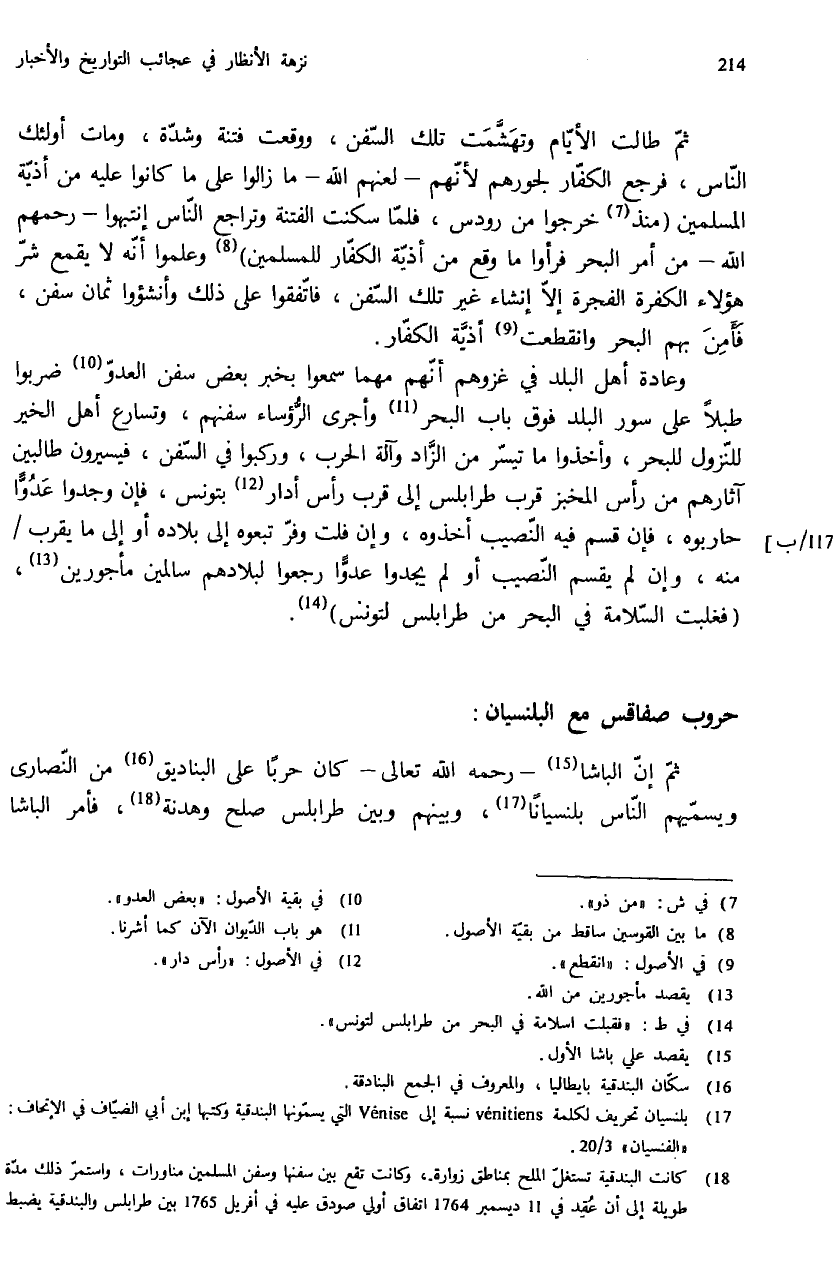 (¬18) كانت البندقية تستغلّ الملح بمناطق زوارة، وكانت تقع بين سفنها وسفن المسلمين مناورات، واستمرّ ذلك مدّة طويلة إلى أن عقد في 11 ديسمبر 1764 اتفاق أولي صودق عليه في أفريل 1765 بين طرابلس والبندقية يضبط =