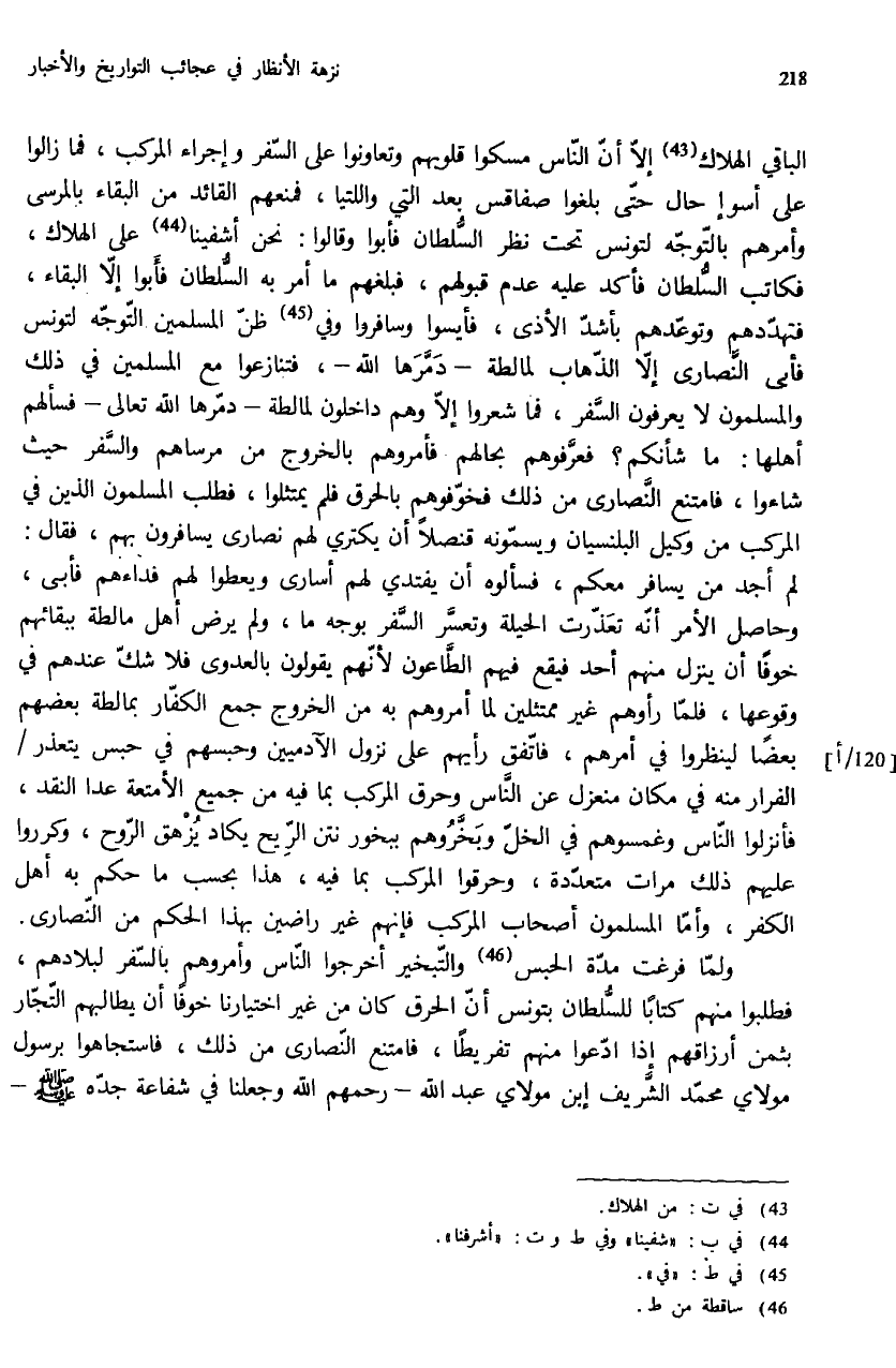 ولمّا فرغت مدّة الحبس (¬46) والتّبخير أخرجوا النّاس وأمروهم بالسّفر لبلادهم، فطلبوا منهم كتابا للسّلطان بتونس أنّ الحرق كان من غير اختيارنا خوفا أن يطالبهم التّجّار بثمن أرزاقهم إذا ادّعوا منهم تفريطا، فامتنع النّصارى من ذلك، فاستجاهوا برسول مولاي محمّد الشّريف إبن مولاي عبد الله - رحمهم الله وجعلنا في شفاعة جدّه صلّى الله عليه وسلم -