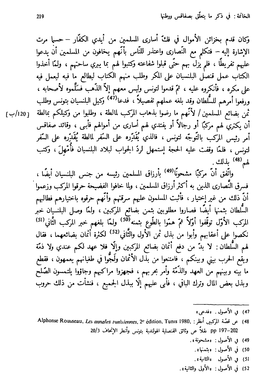 وكان قدم بخزائن الأموال في فكّ أسارى المسلمين من أيدي الكفّار - حسبما مرت الإشارة إليه - فتكلم مع النّصارى واعتذر للنّاس بأنّهم يخافون من المسلمين أن يدعوا عليهم تفريطا، فلم يزل بهم حتّى قبلوا شفاعته وكتبوا لهم بما يبري ساحتهم، ولمّا أخذوا الكتاب عمل قنصل البلنسيان على المكر وطلب منهم الكتاب ليطالع ما فيه ليعمل فيه على مكره، فأنكروه عليه، ثمّ قدموا لتونس وليس معهم إلاّ الذّهب فسلّموه لأصحابه، ورفعوا أمرهم للسّلطان وقد بلغه عملهم تفصيلا، فدعا (¬47) وكيل البلنسيان بتونس وطلب ثمن بضائع المسلمين / لأنّهم ما رضوا بذهاب المركب لمالطة، وطلبوا من وكيلكم بمالطة أن يكتري لهم مركبا أو رجالا أو يفتدي لهم أسارى من أموالهم فأبى، وقائد صفاقس أمر رئيس المركب بالتّوجّه لتونس، فالذي يقدّره على السّفر لمالطة يقدّره على السّفر لتونس، فلمّا وقفت عليه الحجة إستمهل لردّ الجواب لبلاد البلنسيان فأمهل، وكتب لهم (¬48) بذلك.