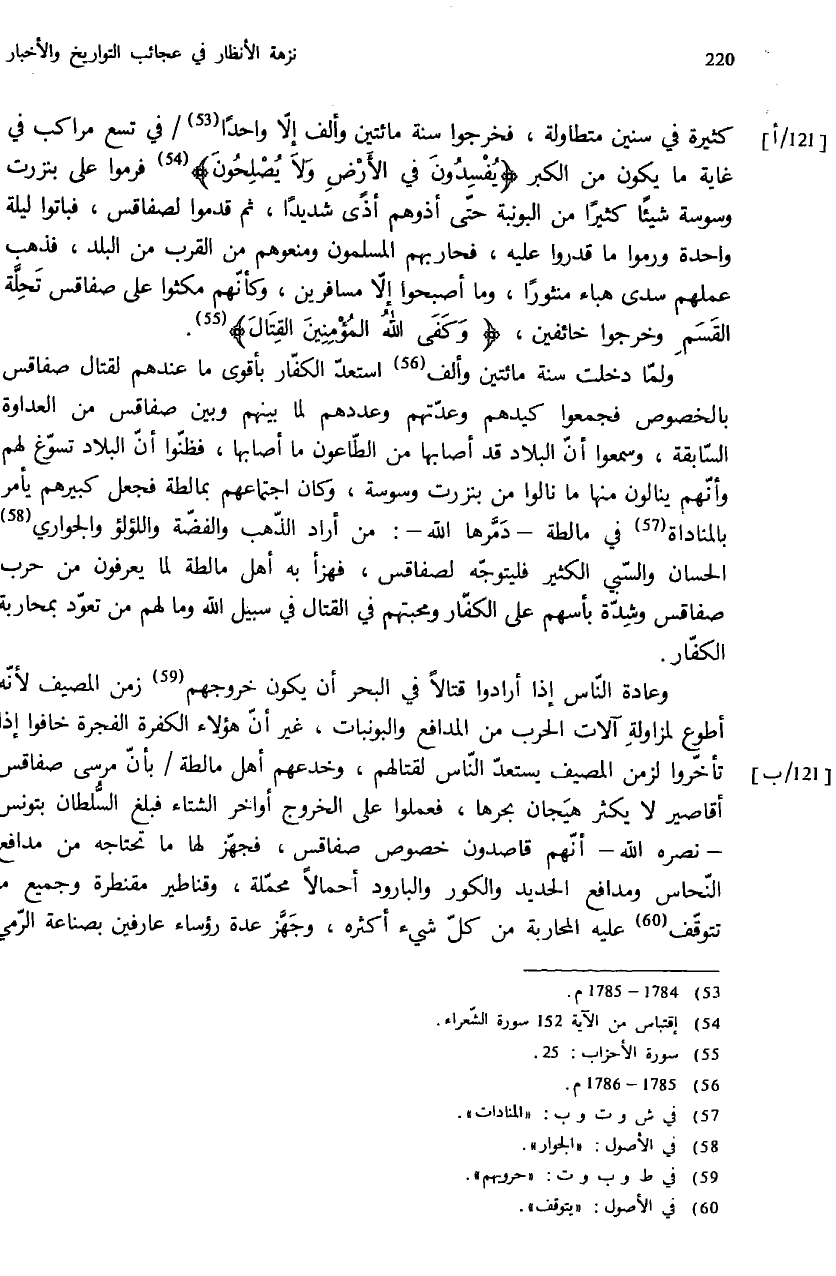كثيرة في سنين متطاولة، فخرجوا سنة مائتين وألف إلاّ واحدا (¬53) / في تسع مراكب في غاية ما يكون من الكبر {يُفْسِدُونَ فِي الْأَرْضِ وَلا يُصْلِحُونَ} (¬54) فرموا على بنزرت وسوسة شيئا كثيرا من البونبة حتّى أذوهم أذى شديدا، ثم قدموا لصفاقس، فباتوا ليلة واحدة ورموا ما قدروا عليه، فحاربهم المسلمون ومنعوهم من القرب من البلد، فذهب عملهم سدى هباء منثورا، وما أصبحوا إلاّ مسافرين، وكأنّهم مكثوا على صفاقس تحلّة القسم وخرجوا خائفين، {وَكَفَى اللهُ الْمُؤْمِنِينَ الْقِتالَ} (¬55).