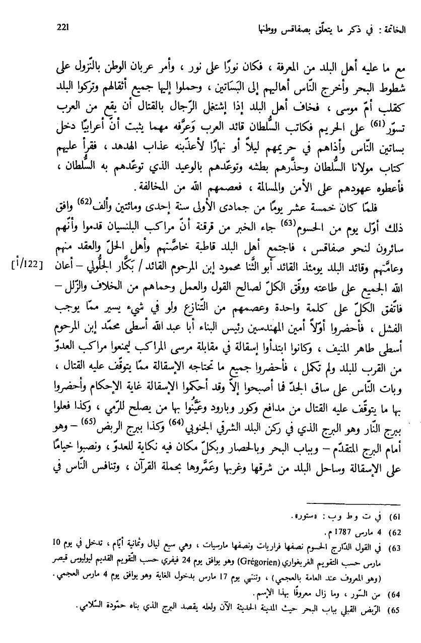 فلمّا كان خمسة عشر يوما من جمادى الأولى سنة إحدى ومائتين وألف (¬62) وافق ذلك أوّل يوم من الحسوم (¬63) جاء الخبر من قرقنة أنّ مراكب البلنسيان قدموا وأنّهم سائرون لنحو صفاقس، فاجتمع أهل البلد قاطبة خاصّتهم وأهل الحلّ والعقد منهم وعامّتهم وقائد البلد يومئذ القائد أبو الثّنا محمود إبن المرحوم القائد / بكّار الجلّولي - أعان الله الجميع على طاعته ووفّق الكلّ لصالح القول والعمل وحماهم من الخلاف والزّلل - فاتّفق الكلّ على كلمة واحدة وعصمهم من التّنازع ولو في شيء يسير ممّا يوجب الفشل، فأحضروا أوّلا أمين المهندسين رئيس البناء أبا عبد الله أسطى محمّد إبن المرحوم أسطى طاهر المنيف، وكانوا ابتدأوا إسقالة في مقابلة مرسى المراكب ليمنعوا مراكب العدوّ من القرب للبلد ولم تكمل، فأحضروا جميع ما تحتاجه الإسقالة ممّا يتوقّف عليه القتال، وبات النّاس على ساق الجدّ فما أصبحوا إلاّ وقد أحكموا الإسقالة غاية الإحكام وأحضروا بها ما يتوقّف عليه القتال من مدافع وكور وبارود وعيّنوا بها من يصلح للرّمي، وكذا فعلوا ببرج النّار وهو البرج الذي في ركن البلد الشرقي الجنوبي (¬64) وكذا ببرج الربض (¬65) - وهو أمام البرج المتقدّم - وبباب البحر وبالحصار وبكلّ مكان فيه نكاية للعدوّ، ونصبوا خياما على الإسقالة وساحل البلد من شرقها وغربها وعمّروها بحملة القرآن، وتنافس النّاس في