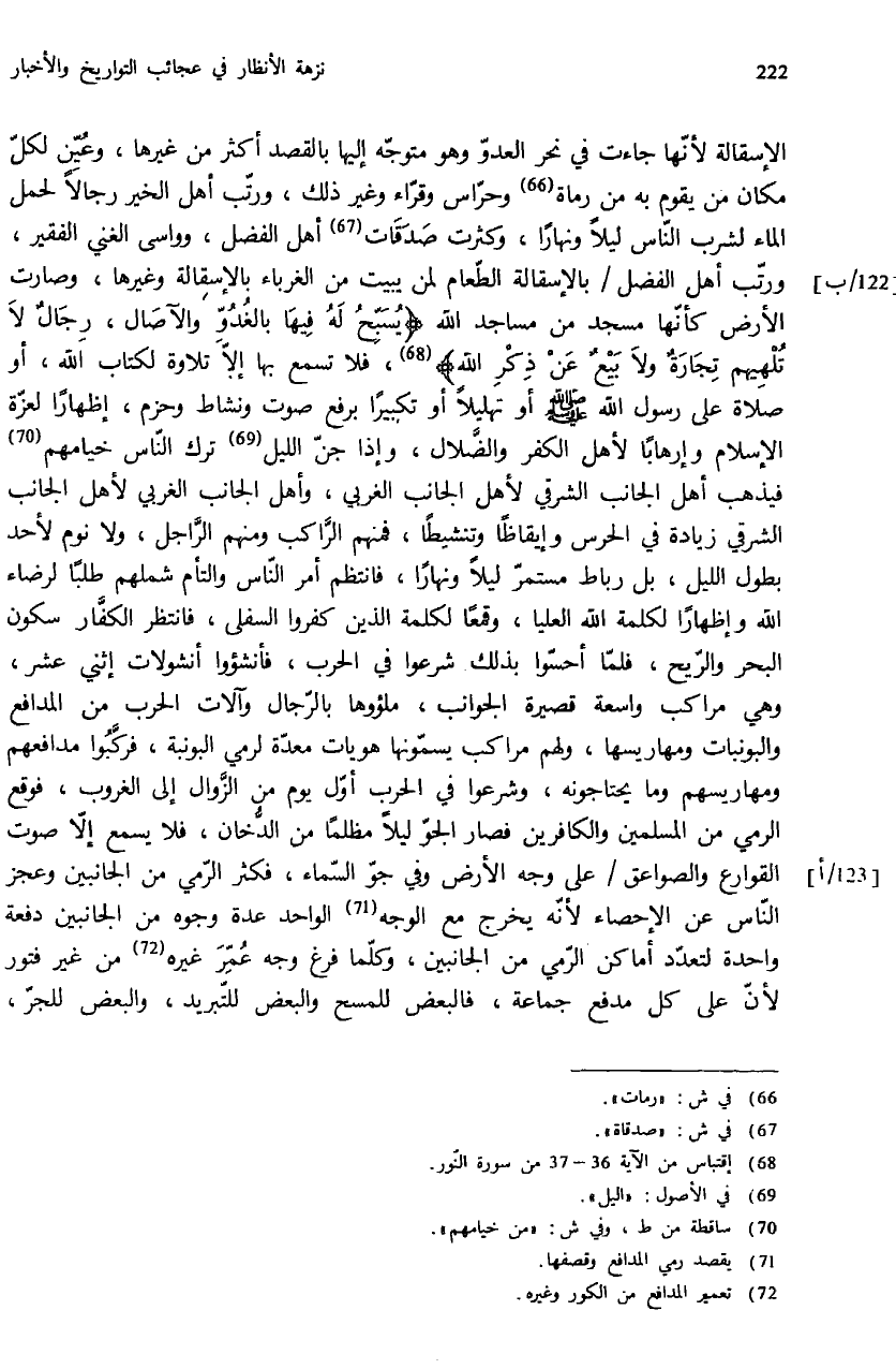 الإسقالة لأنّها جاءت في نحر العدوّ وهو متوجّه إليها بالقصد أكثر من غيرها، وعيّن لكلّ مكان من يقوم به من رماة (¬66) وحرّاس وقرّاء وغير ذلك، ورتّب أهل الخير رجالا لحمل الماء لشرب النّاس ليلا ونهارا، وكثرت صدقات (¬67) أهل الفضل، وواسى الغني الفقير، ورتّب أهل الفضل / بالإسقالة الطّعام لمن يبيت من الغرباء بالإسقالة وغيرها، وصارت الأرض كأنّها مسجد من مساجد الله {يُسَبِّحُ لَهُ فِيها بِالْغُدُوِّ وَالْآصالِ، رِجالٌ لا تُلْهِيهِمْ تِجارَةٌ وَلا بَيْعٌ عَنْ ذِكْرِ اللهِ} (¬68)، فلا تسمع بها إلاّ تلاوة لكتاب الله، أو صلاة على رسول الله صلّى الله عليه وسلم أو تهليلا أو تكبيرا برفع صوت ونشاط وحزم، إظهارا لعزّة الإسلام وإرهابا لأهل الكفر والضّلال، وإذا جنّ الليل (¬69) ترك النّاس خيامهم (¬70) فيذهب أهل الجانب الشرقي لأهل الجانب الغربي، وأهل الجانب الغربي لأهل الجانب الشرقي زيادة في الحرس وإيقاظا وتنشيطا، فمنهم الرّاكب ومنهم الرّاجل، ولا نوم لأحد بطول الليل، بل رباط مستمرّ ليلا ونهارا، فانتظم أمر النّاس والتأم شملهم طلبا لرضاء الله وإظهارا لكلمة الله العليا، وقمعا لكلمة الذين كفروا السفلى، فانتظر الكفّار سكون البحر والرّيح، فلمّا أحسّوا بذلك شرعوا في الحرب، فأنشؤوا أنشولات إثني عشر، وهي مراكب واسعة قصيرة الجوانب، ملؤوها بالرّجال وآلات الحرب من المدافع والبونبات ومهاريسها، ولهم مراكب يسمّونها هويات معدّة لرمي البونبة، فركّبوا مدافعهم ومهاريسهم وما يحتاجونه، وشرعوا في الحرب أوّل يوم من الزّوال إلى الغروب، فوقع الرمي من المسلمين والكافرين فصار الجوّ ليلا مظلما من الدّخان، فلا يسمع إلاّ صوت القوارع والصواعق / على وجه الأرض وفي جوّ السّماء، فكثر الرّمي من الجانبين وعجز النّاس عن الإحصاء لأنّه يخرج مع الوجه (¬71) الواحد عدة وجوه من الجانبين دفعة واحدة لتعدّد أماكن الرّمي من الجانبين، وكلّما فرغ وجه عمّر غيره (¬72) من غير فتور لأنّ على كل مدفع جماعة، فالبعض للمسح والبعض للتّبريد، والبعض للجرّ،