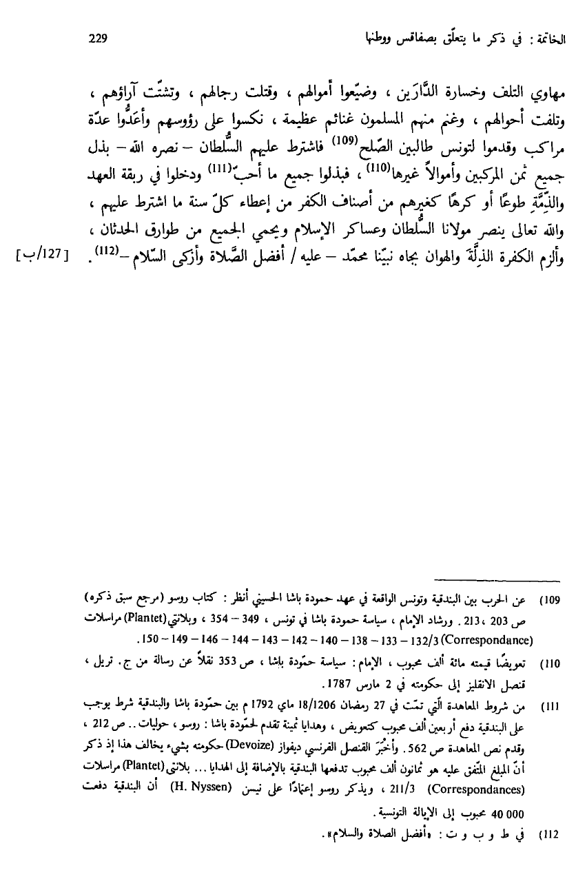 (¬109) عن الحرب بين البندقية وتونس الواقعة في عهد حمودة باشا الحسيني أنظر: كتاب روسو (مرجع سبق ذكره) ص: 203، 213. ورشاد الإمام، سياسة حمودة باشا في تونس، 349 - 354، وبلانتي (Plantet) مراسلات 3/ 132 - 133 - 138 - 140 - 142 - 143 - 144 - 146 - 149 - 150 (Correspondance).