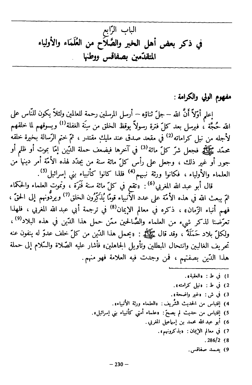 إعلم أوّلا أنّ الله - جلّ ثناؤه - أرسل المرسلين رحمة للعالمين ولئلاّ يكون للنّاس على الله حجّة، فيرسل بعد كلّ فترة رسولا يوقظ الخلق من سنة الغفلة (¬1) ويسوقهم لما خلقهم لأجله من نيل كراماته (¬2) في مقعد صدق عند مليك مقتدر، ثمّ ختم الرّسالة بخيرة خلقه محمّد صلّى الله عليه وسلم فجعل شرّ كلّ مائة (¬3) في آخرها فيضعف حملة الدّين إمّا بموت أو ظلم أو جور أو غير ذلك، وجعل على رأس كلّ مائة سنة من يجدّد لهذه الأمّة أمر دينها من العلماء والأولياء، فكانوا ورثة نبيهم (¬4) فلذا كانوا كأنبياء بني إسرائيل (¬5).