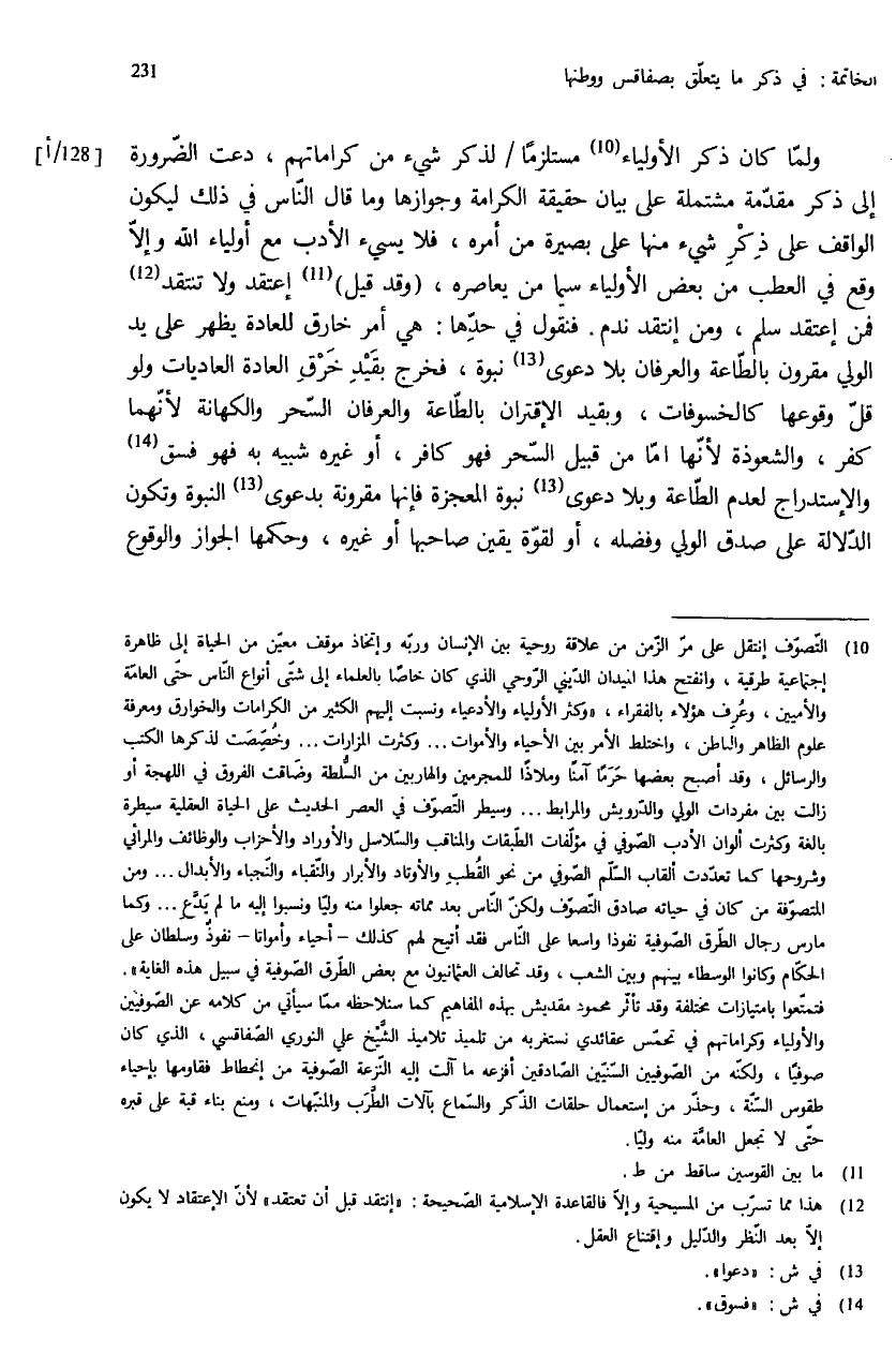 (¬10) التّصوّف إنتقل على مرّ الزّمن من علاقة روحية بين الإنسان وربّه واتخاذ موقف معيّن من الحياة إلى ظاهرة إجتماعية طرقية، وانفتح هذا الميدان الدّيني الرّوحي الذي كان خاصا بالعلماء إلى شتّى أنواع النّاس حتّى العامّة والأميين، وعرف هؤلاء بالفقراء، «وكثر الأولياء والأدعياء ونسبت إليهم الكثير من الكرامات والخوارق ومعرفة علوم الظاهر والباطن، واختلط الأمر بين الأحياء والأموات. . . وكثرت المزارات. . . وخصّصت لذكرها الكتب والرسائل، وقد أصبح بعضها حرما آمنا وملاذا للمجرمين والهاربين من السّلطة وضاقت الفروق في اللهجة أو زالت بين مفردات الولي والدّرويش والمرابط. . . وسيطر التّصوّف في العصر الحديث على الحياة العقلية سيطرة بالغة وكثرت ألوان الأدب الصّوفي في مؤلّفات الطّبقات والمناقب والسّلاسل والأوراد والأحزاب والوظائف والمرائي وشروحها كما تعدّدت ألقاب السّلّم الصّوفي من نحو القطب والأوتاد والأبرار والنّقباء والنّجباء والأبدال. . . ومن المتصوّفة من كان في حياته صادق التّصوّف ولكنّ النّاس بعد مماته جعلوا منه وليّا ونسبوا إليه ما لم يدّع. . . وكما مارس رجال الطّرق الصّوفية نفوذا واسعا على النّاس فقد أتيح لهم كذلك - أحياء وأمواتا - نفوذ وسلطان على الحكّام وكانوا الوسطاء بينهم وبين الشعب، وقد تحالف العثمانيون مع بعض الطّرق الصّوفية في سبيل هذه الغاية». فتمتّعوا بامتيازات مختلفة وقد تأثّر محمود مقديش بهذه المفاهيم كما سنلاحظه ممّا سيأتي من كلامه عن الصّوفيين والأولياء وكراماتهم في تحمّس عقائدي نستغربه من تلميذ تلاميذ الشّيخ علي النوري الصّفاقسي، الذي كان صوفيا، ولكنّه من الصّوفيين السّنيّين الصّادقين أفزعه ما آلت إليه النّزعة الصّوفية من إنحطاط فقاومها بإحياء طقوس السّنّة، وحذّر من إستعمال حلقات الذّكر والسّماع بآلات الطّرب والمنبّهات، ومنع بناء قبة على قبره حتّى لا تجعل العامّة منه وليّا.