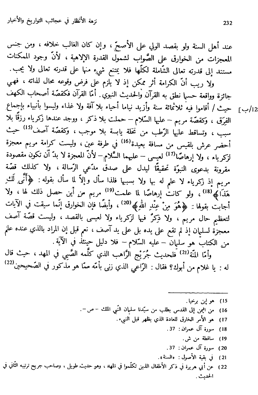 ولا ريب أنّ الكرامة أثر ممكن إذ لا يلزم على فرض وقوعه محال لذاته، فهي جائزة وواقعة حسبما نطق به القرآن والحديث النبوي. أمّا القرآن فكقصّة أصحاب الكهف حيث / أقاموا فيه ثلاثمائة سنة وأزيد نياما أحياء بلا آفة ولا غذاء وليسوا بأنبياء بإجماع الفرق، وكقصّة مريم - عليها السّلام - حملت بلا ذكر، ووجد عندها زكرياء رزقا بلا سبب، وتساقط عليها الرّطب من نخلة يابسة بلا موجب، وكقصّة آصف (¬15) حيث أحضر عرش بلقيس من مسافة بعيدة (¬16) في طرفة عين، وليست كرامة مريم معجزة لزكرياء، ولا إرهاصا (¬17) لعيسى - عليهما السّلام - لأنّ المعجزة لا بدّ أن تكون مقصودة مقرونة بدعوى النبوّة تحقيقا ليدل على صدق مدّعي الرّسالة، ولا كذلك قصّة مريم إذ زكرياء لا علم له بها ولا بسببها فلذا سأل وإلاّ لما سأل بقوله: {أَنّى لَكِ هذا} (¬18)، ولو كانت إرهاصا لما علمت (¬19) مريم من أين حصل ذلك لها، ولا أجابت بقولها: {هُوَ مِنْ عِنْدِ اللهِ} (¬20)، وأيضا فإن الخوارق إنّما سيقت في الآيات لتعظيم حال مريم، ولا ذكر فيها لزكرياء ولا لعيسى بالقصد، وليست قصّة آصف معجزة لسليمان إذ لم تقع على يده بل على يد آصف، نعم قيل إن المراد بالذي عنده علم من الكتاب هو سليمان - عليه السّلام - فلا دليل حينئذ في الآية.
