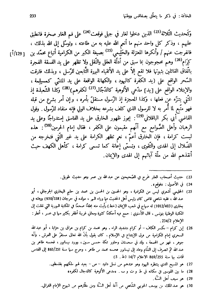 (¬25) الحليمي أشعري ليس من الكرامية، وهو الحسين بن الحسن بن محمد بن حليم البخاري الجرجاني، أبو عبد الله، فقيه شافعي قاض كان رئيس أهل الحديث فيما وراء النهر، مولده في جرجان (338/ 950) ووفاته في بخارى (403/ 1012) له منهاج في شعب الإيمان (خط) رأيت منه مجلدا ضخما في المكتبة النورية التي نقلت إلى المكتبة الوطنية بتونس، قال الأستوي: جمع فيه أحكاما كثيرة ومعاني غريبة أظفر بكثير منها في عسر، أنظر: الإعلام 2/ 234.