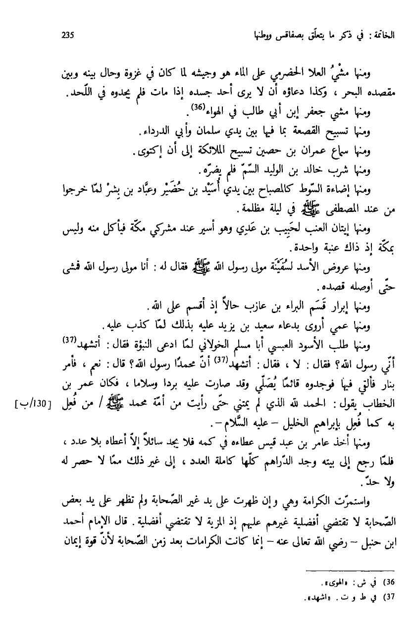 ومنها مشي العلا الحضرمي على الماء هو وجيشه لما كان في غزوة وحال بينه وبين مقصده البحر، وكذا دعاؤه أن لا يرى أحد جسده إذا مات فلم يجدوه في اللّحد.