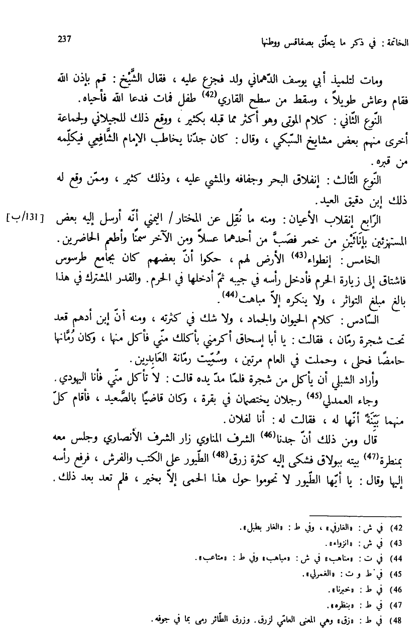 الخامس: إنطواء (¬43) الأرض لهم، حكوا أنّ بعضهم كان بجامع طرسوس فاشتاق إلى زيارة الحرم فأدخل رأسه في جيبه ثمّ أدخلها في الحرم. والقدر المشترك في هذا بالغ مبلغ التواثر، ولا ينكره إلاّ مباهت (¬44).