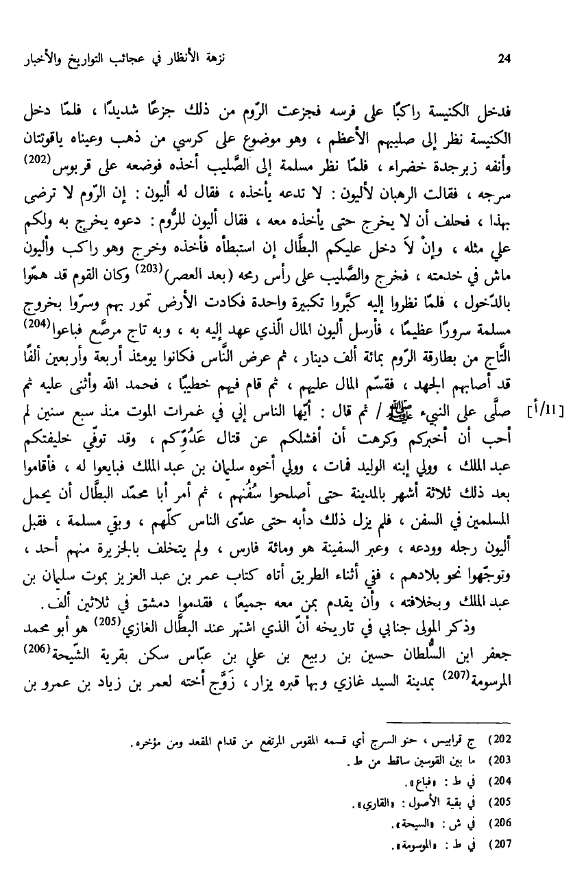 فدخل الكنيسة راكبا على فرسه فجزعت الرّوم من ذلك جزعا شديدا، فلمّا دخل الكنيسة نظر إلى صليبهم الأعظم، وهو موضوع على كرسي من ذهب وعيناه ياقوتتان وأنفه زبرجدة خضراء، فلمّا نظر مسلمة إلى الصّليب أخذه فوضعه على قربوس (¬202) سرجه، فقالت الرهبان لأليون: لا تدعه يأخذه، فقال له أليون: إن الرّوم لا ترضى بهذا، فحلف أن لا يخرج حتى يأخذه معه، فقال أليون للرّوم: دعوه يخرج به ولكم علي مثله، وإن لا دخل عليكم البطّال إن استبطأه فأخذه وخرج وهو راكب وأليون ماش في خدمته، فخرج والصّليب على رأس رمحه (بعد العصر) (¬203) وكان القوم قد همّوا بالدّخول، فلمّا نظروا إليه كبّروا تكبيرة واحدة فكادت الأرض تمور بهم وسرّوا بخروج مسلمة سرورا عظيما، فأرسل أليون المال الّذي عهد إليه به، وبه تاج مرصّع فباعوا (¬204) التّاج من بطارقة الرّوم بمائة ألف دينار، ثم عرض النّاس فكانوا يومئذ أربعة وأربعين ألفا قد أصابهم الجهد، فقسّم المال عليهم، ثم قام فيهم خطيبا، فحمد الله وأثنى عليه ثم صلّى على النبيء صلّى الله عليه وسلم / ثم قال: أيّها الناس إني في غمرات الموت منذ سبع سنين لم أحب أن أخبركم وكرهت أن أفشلكم عن قتال عدوّكم، وقد توفّي خليفتكم عبد الملك، وولي إبنه الوليد فمات، وولي أخوه سليمان بن عبد الملك فبايعوا له، فأقاموا بعد ذلك ثلاثة أشهر بالمدينة حتى أصلحوا سفنهم، ثم أمر أبا محمّد البطّال أن يحمل المسلمين في السفن، فلم يزل ذلك دأبه حتى عدّى الناس كلّهم، وبقي مسلمة، فقبل أليون رجله وودعه، وعبر السفينة هو ومائة فارس، ولم يتخلف بالجزيرة منهم أحد، وتوجّهوا نحو بلادهم، ففي أثناء الطريق أتاه كتاب عمر بن عبد العزيز بموت سليمان بن عبد الملك وبخلافته، وأن يقدم بمن معه جميعا، فقدموا دمشق في ثلاثين ألف.