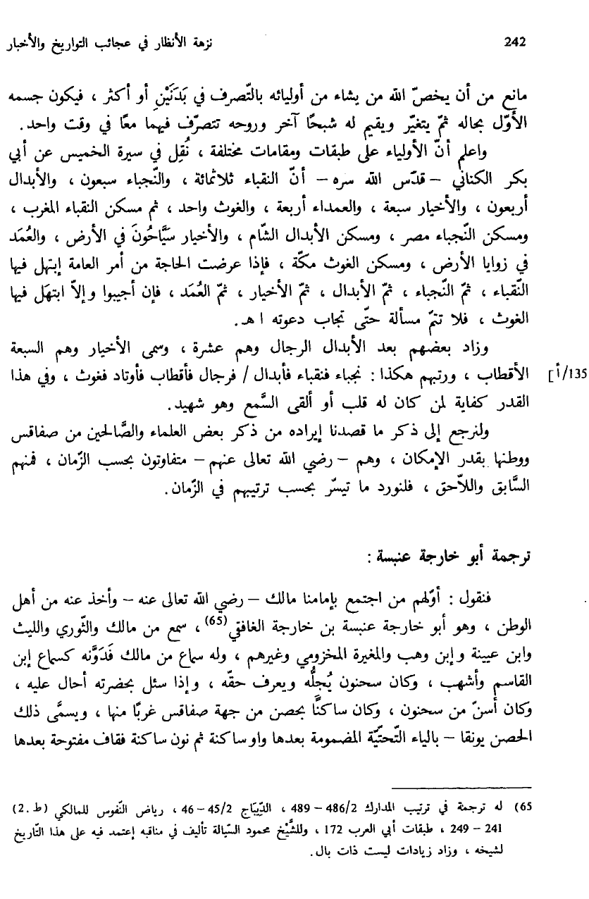 واعلم أنّ الأولياء على طبقات ومقامات مختلفة، نقل في سيرة الخميس عن أبي بكر الكناني - قدّس الله سره - أنّ النقباء ثلاثمائة، والنّجباء سبعون، والأبدال أربعون، والأخيار سبعة، والعمداء أربعة، والغوث واحد، ثم مسكن النقباء المغرب، ومسكن النّجباء مصر، ومسكن الأبدال الشّام، والأخيار سيّاحون في الأرض، والعمد في زوايا الأرض، ومسكن الغوث مكّة، فإذا عرضت الحاجة من أمر العامة إبتهل فيها النّقباء، ثمّ النّجباء، ثمّ الأبدال، ثمّ الأخيار، ثمّ العمد، فإن أجيبوا وإلاّ ابتهل فيها الغوث، فلا تتمّ مسألة حتّى تجاب دعوته اهـ.