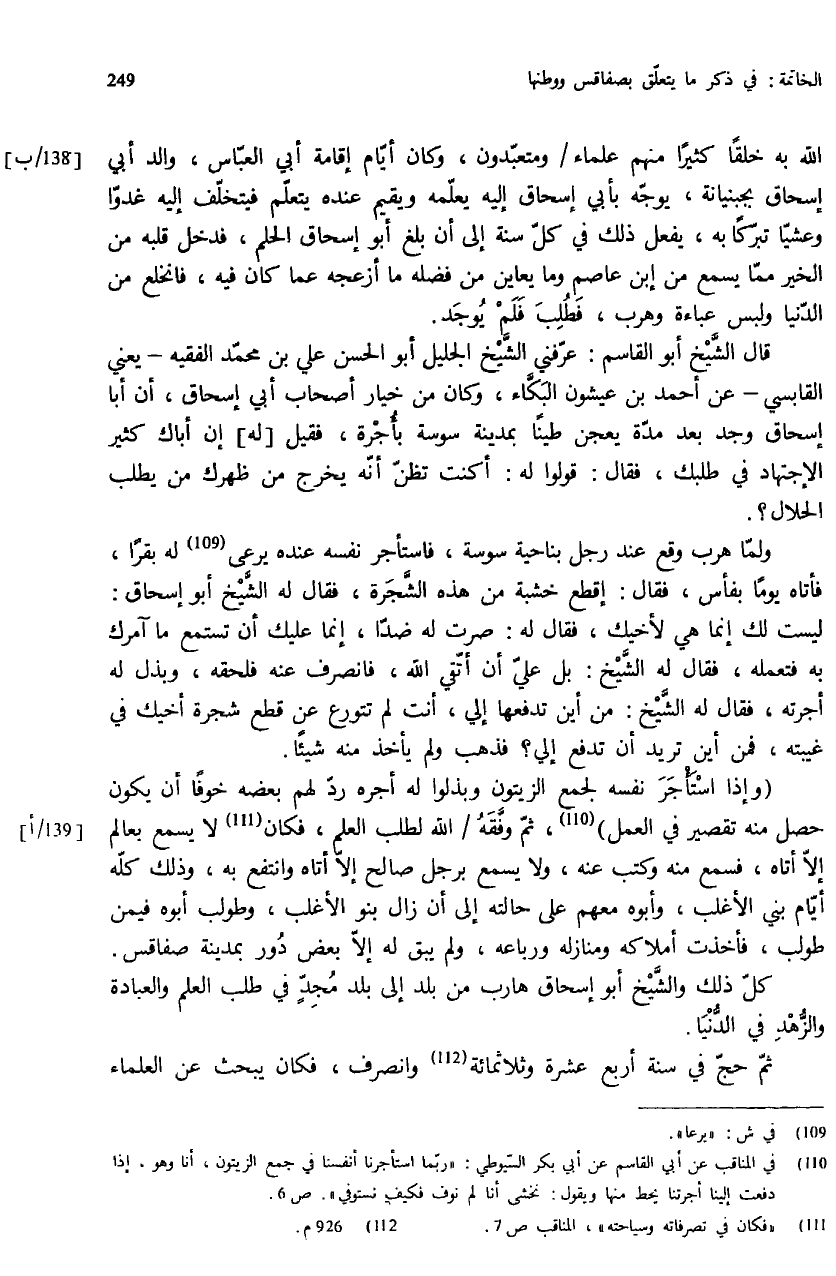 (وإذا استأجر نفسه لجمع الزيتون وبذلوا له أجره ردّ لهم بعضه خوفا أن يكون حصل منه تقصير في العمل) (¬110)، ثمّ وفّقه / الله لطلب العلم، فكان (¬111) لا يسمع بعالم إلاّ أتاه، فسمع منه وكتب عنه، ولا يسمع برجل صالح إلاّ أتاه وانتفع به، وذلك كلّه أيّام بني الأغلب، وأبوه معهم على حالته إلى أن زال بنو الأغلب، وطولب أبوه فيمن طولب، فأخذت أملاكه ومنازله ورباعه، ولم يبق له إلاّ بعض دور بمدينة صفاقس.