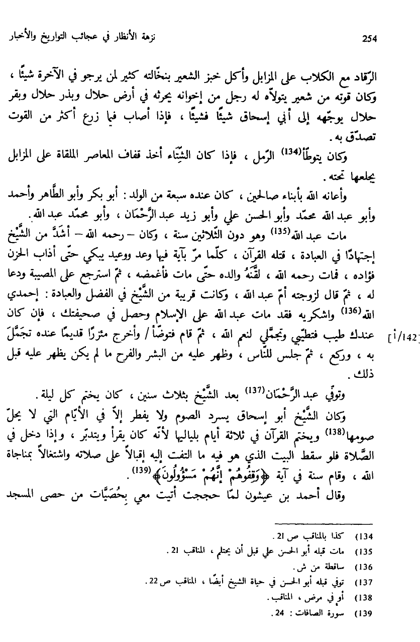 وكان الشّيخ أبو إسحاق يسرد الصوم ولا يفطر إلاّ في الأيّام التي لا يحلّ صومها (¬138) ويختم القرآن في ثلاثة أيام بلياليها لأنّه كان يقرأ ويتدبّر، وإذا دخل في الصّلاة فلو سقط البيت الذي هو فيه ما التفت إليه إقبالا على صلاته واشتغالا بمناجاة الله، وقام سنة في آية {وَقِفُوهُمْ إِنَّهُمْ مَسْؤُلُونَ} (¬139).