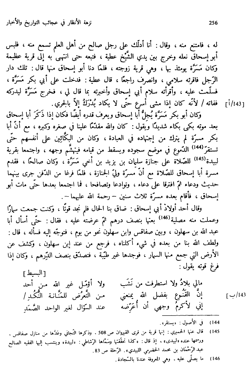 وكان أبو بكر مسرّة يجلّ أبا إسحاق ويعرف قدره أيضا فكان إذا ذكر أبا إسحاق بعد موته بكى بكاء شديدا ويقول: كان والله مقدّما علينا في صغره وكبره، مع أنّ أبا بكر مسرّة لم يترك من إجتهاده في العبادة، وكان من البكّائين على أنفسهم حتّى تستقرّ (¬144) الدّموع في موضع سجوده ويسقط من قيامه فيتهشّم وجهه، واجتمعا بقرية لبيدة (¬145) للصّلاة على جنازة سليمان بن يزيد بن أخي مسرّة، وكان صالحا، فقدم مسرة أبا إسحاق للصّلاة مع أنّ مسرّة وليّ الجنازة، فلمّا فرغا من الدّفن جرى بينهما حديث ودعاء ثمّ افترقا على دعاء، وتوادعا وتصافحا، فما اجتمعا بعدها حتّى مات أبو إسحاق، فأقام بعده مسرّة ثلاث سنين - رحمة الله عليهما -.