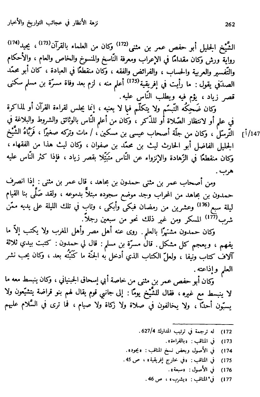 الشّيخ الجليل أبو حفص عمر بن مثنى (¬172) وكان من العلماء بالقرآن (¬173)، يجيد (¬174) رواية ورش وكان مقداما في الإعراب ومعرفة النّاسخ والمنسوخ والخاص والعام، والأحكام والتّفسير والعربية والحساب، والفرائض والفقه، وكان منقطعا في العبادة، كان أبو محمّد الصدفي يقول: ما رأيت في إفريقية (¬175) أعلم منه، لزم بعد وفاة مسرّة بن مسلم سكنى قصر زياد، يؤم فيه ويطلب النّاس عليه.