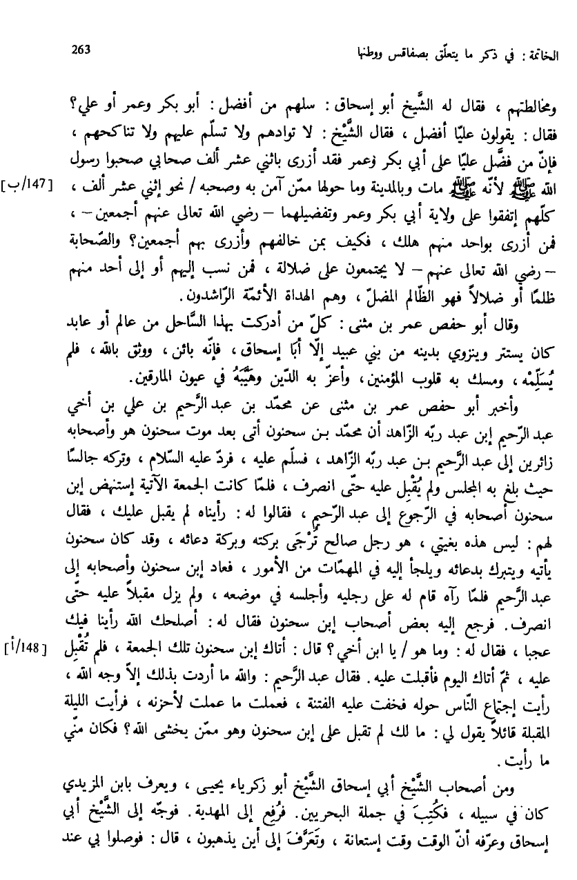 ومخالطتهم، فقال له الشّيخ أبو إسحاق: سلهم من أفضل: أبو بكر وعمر أو علي؟ فقال: يقولون عليّا أفضل، فقال الشّيخ: لا توادهم ولا تسلّم عليهم ولا تناكحهم، فإنّ من فضّل عليّا على أبي بكر وعمر فقد أزرى باثني عشر ألف صحابي صحبوا رسول الله صلّى الله عليه وسلم لأنّه صلّى الله عليه وسلم مات وبالمدينة وما حولها ممّن آمن به وصحبه / نحو إثني عشر ألف، كلّهم إتفقوا على ولاية أبي بكر وعمر وتفضيلهما - رضي الله تعالى عنهم أجمعين -، فمن أزرى بواحد منهم هلك، فكيف بمن خالفهم وأزرى بهم أجمعين؟ والصّحابة - رضي الله تعالى عنهم - لا يجتمعون على ضلالة، فمن نسب إليهم أو إلى أحد منهم ظلما أو ضلالا فهو الظّالم المضلّ، وهم الهداة الأئمّة الرّاشدون.