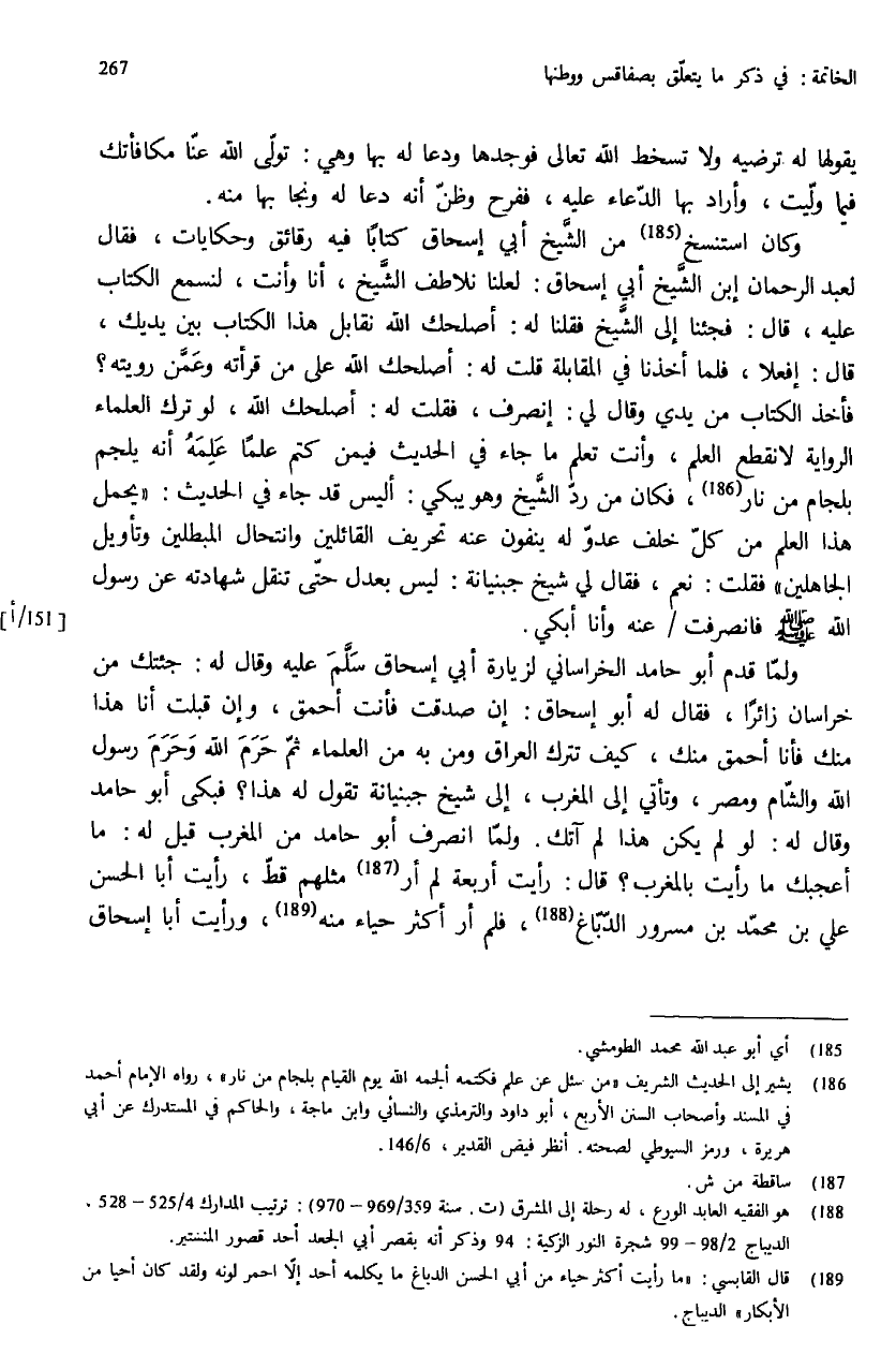 (¬186) يشير إلى الحديث الشريف «من سئل عن علم فكتمه ألجمه الله يوم القيام بلجام من نار»، رواه الإمام أحمد في المسند وأصحاب السنن الأربع، أبو داود والترمذي والنسائي وابن ماجة، والحاكم في المستدرك عن أبي هريرة، ورمز السيوطي لصحته. أنظر فيض القدير، 6/ 146.