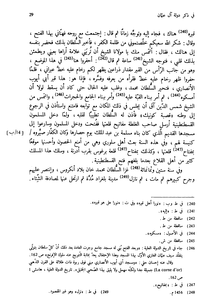 (¬246) جاء في تاريخ الدولة العلية: «وبعد الفتح بني له مسجد جامع وجرت العادة بعد ذلك أنّ كلّ سلطان يتولّى يتقلّد سيف عثمان الغازي الأوّل بهذا المسجد وهذا الإحتفال يعدّ بمثابة التّتويج عند ملوك الإفرنج» ص: 162. وقال عنه إحسان حقي: «ومسجد أبي أيوب الأنصاري مبني فوق ربوة ذات طلالة على القرن الذّهبي (La corne d' or) جميلة جدا ولكنّه مهمل ولا يليق بهذا الصّحبي الجليل». تاريخ الدولة العلية، هامش 1 ص: 162.
