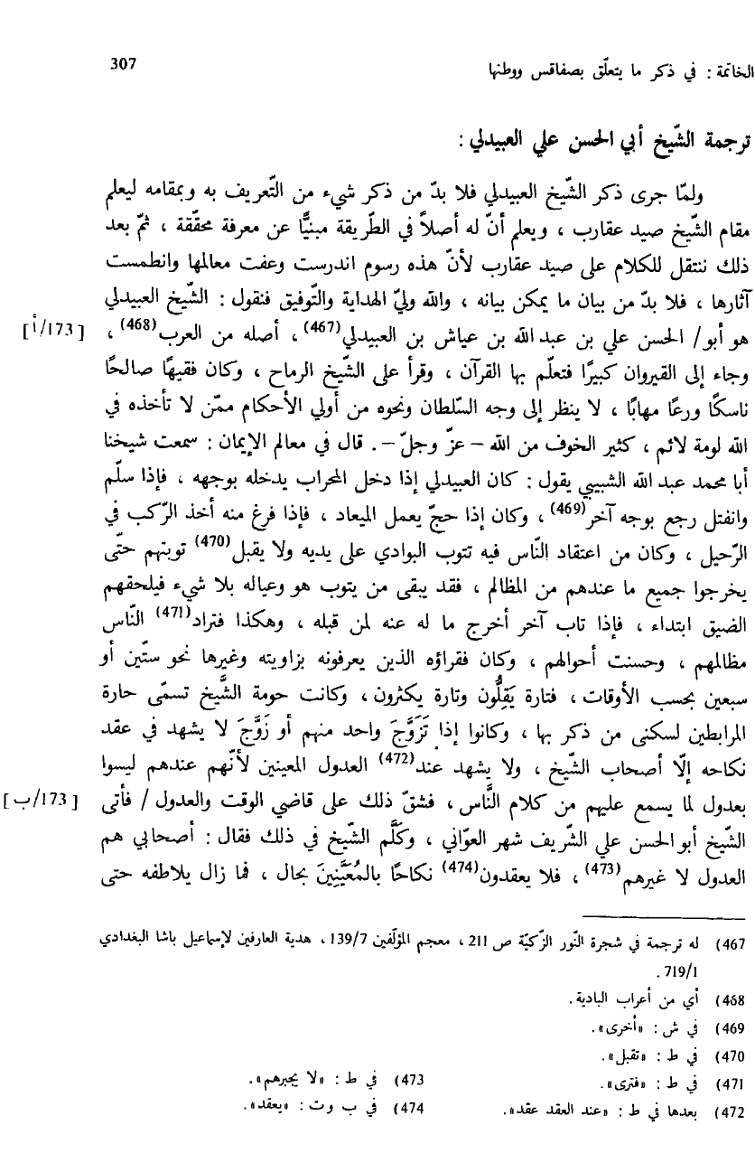 ولمّا جرى ذكر الشّيخ العبيدلي فلا بدّ من ذكر شيء من التّعريف به وبمقامه ليعلم مقام الشّيخ صيد عقارب، ويعلم أنّ له أصلا في الطّريقة مبنيّا عن معرفة محقّقة، ثمّ بعد ذلك ننتقل للكلام على صيد عقارب لأنّ هذه رسوم اندرست وعفت معالمها وانطمست آثارها، فلا بدّ من بيان ما يمكن بيانه، والله وليّ الهداية والتّوفيق فنقول: الشّيخ العبيدلي هو أبو / الحسن علي بن عبد الله بن عياش بن العبيدلي (¬467)، أصله من العرب (¬468)، وجاء إلى القيروان كبيرا فتعلّم بها القرآن، وقرأ على الشّيخ الرماح، وكان فقيها صالحا ناسكا ورعا مهابا، لا ينظر إلى وجه السّلطان ونحوه من أولي الأحكام ممّن لا تأخذه في الله لومة لائم، كثير الخوف من الله - عزّ وجلّ -. قال في معالم الإيمان: سمعت شيخنا أبا محمد عبد الله الشبيبي يقول: كان العبيدلي إذا دخل المحراب يدخله بوجهه، فإذا سلّم وانفتل رجع بوجه آخر (¬469)، وكان إذا حجّ يعمل الميعاد، فإذا فرغ منه أخذ الرّكب في الرّحيل، وكان من اعتقاد النّاس فيه تتوب البوادي على يديه ولا يقبل (¬470) توبتهم حتّى يخرجوا جميع ما عندهم من المظالم، فقد يبقى من يتوب هو وعياله بلا شيء فيلحقهم الضيق ابتداء، فإذا تاب آخر أخرج ما له عنه لمن قبله، وهكذا فتراد (¬471) النّاس مظالمهم، وحسنت أحوالهم، وكان فقراؤه الذين يعرفونه بزاويته وغيرها نحو ستّين أو سبعين بحسب الأوقات، فتارة يقلّون وتارة يكثرون، وكانت حومة الشّيخ تسمّى حارة المرابطين لسكنى من ذكر بها، وكانوا إذا تزوّج واحد منهم أو زوّج لا يشهد في عقد نكاحه إلاّ أصحاب الشّيخ، ولا يشهد عند (¬472) العدول المعينين لأنّهم عندهم ليسوا بعدول لما يسمع عليهم من كلام النّاس، فشقّ ذلك على قاضي الوقت والعدول / فأتى الشّيخ أبو الحسن علي الشّريف شهر العوّاني، وكلّم الشّيخ في ذلك فقال: أصحابي هم العدول لا غيرهم (¬473)، فلا يعقدون (¬474) نكاحا بالمعيّنين بحال، فما زال يلاطفه حتى