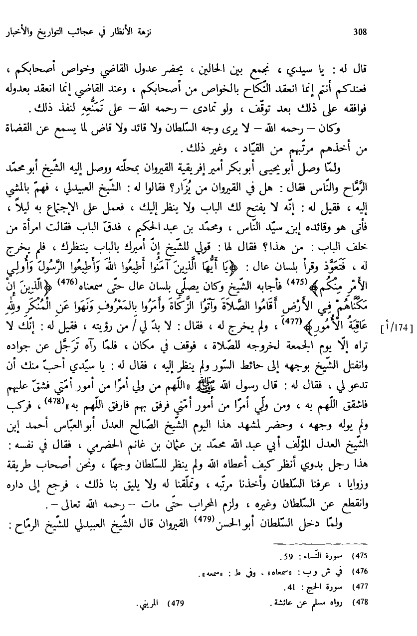 ولمّا وصل أبو يحيى أبو بكر أمير إفريقية القيروان بمحلّته ووصل إليه الشّيخ أبو محمّد الرّمّاح والنّاس فقال: هل في القيروان من يزار؟ فقالوا له: الشّيخ العبيدلي، فهمّ بالمشي إليه، فقيل له: إنّه لا يفتح لك الباب ولا ينظر إليك، فعمل على الإجتماع به ليلا، فأتى هو وقائده إبن سيّد النّاس، ومحمّد بن عبد الحكيم، فدقّ الباب فقالت امرأة من خلف الباب: من هذا؟ فقال لها: قولي للشّيخ إنّ أميرك بالباب ينتظرك، فلم يخرج له، فتعوّذ وقرأ بلسان عال: {يا أَيُّهَا الَّذِينَ آمَنُوا أَطِيعُوا اللهَ وَأَطِيعُوا الرَّسُولَ وَأُولِي الْأَمْرِ مِنْكُمْ} (¬475) فأجابه الشّيخ وكان يصلّي بلسان عال حتّى سمعناه (¬476) {الَّذِينَ إِنْ مَكَّنّاهُمْ فِي الْأَرْضِ أَقامُوا الصَّلاةَ وَآتَوُا الزَّكاةَ وَأَمَرُوا بِالْمَعْرُوفِ وَنَهَوْا عَنِ الْمُنْكَرِ وَلِلّهِ عاقِبَةُ الْأُمُورِ} (¬477)، ولم يخرج له، فقال: لا بدّ لي / من رؤيته، فقيل له: إنّك لا تراه إلاّ يوم الجمعة لخروجه للصّلاة، فوقف في مكان، فلمّا رآه ترجّل عن جواده وانفتل الشّيخ بوجهه إلى حائط السّور ولم ينظر إليه، فقال له: يا سيّدي أحبّ منك أن تدعو لي، فقال له: قال رسول الله صلّى الله عليه وسلم «اللهم من ولي أمرا من أمور أمّتي فشقّ عليهم فاشقق اللهم به، ومن ولّي أمرا من أمور أمّتي فرفق بهم فارفق اللهم به» (¬478)، فركب ولم يوله وجهه، وحضر لمشهد هذا اليوم الشّيخ الصّالح العدل أبو العبّاس أحمد إبن الشّيخ العدل المؤلّف أبي عبد الله محمّد بن عثمان بن غانم الحضرمي، فقال في نفسه: