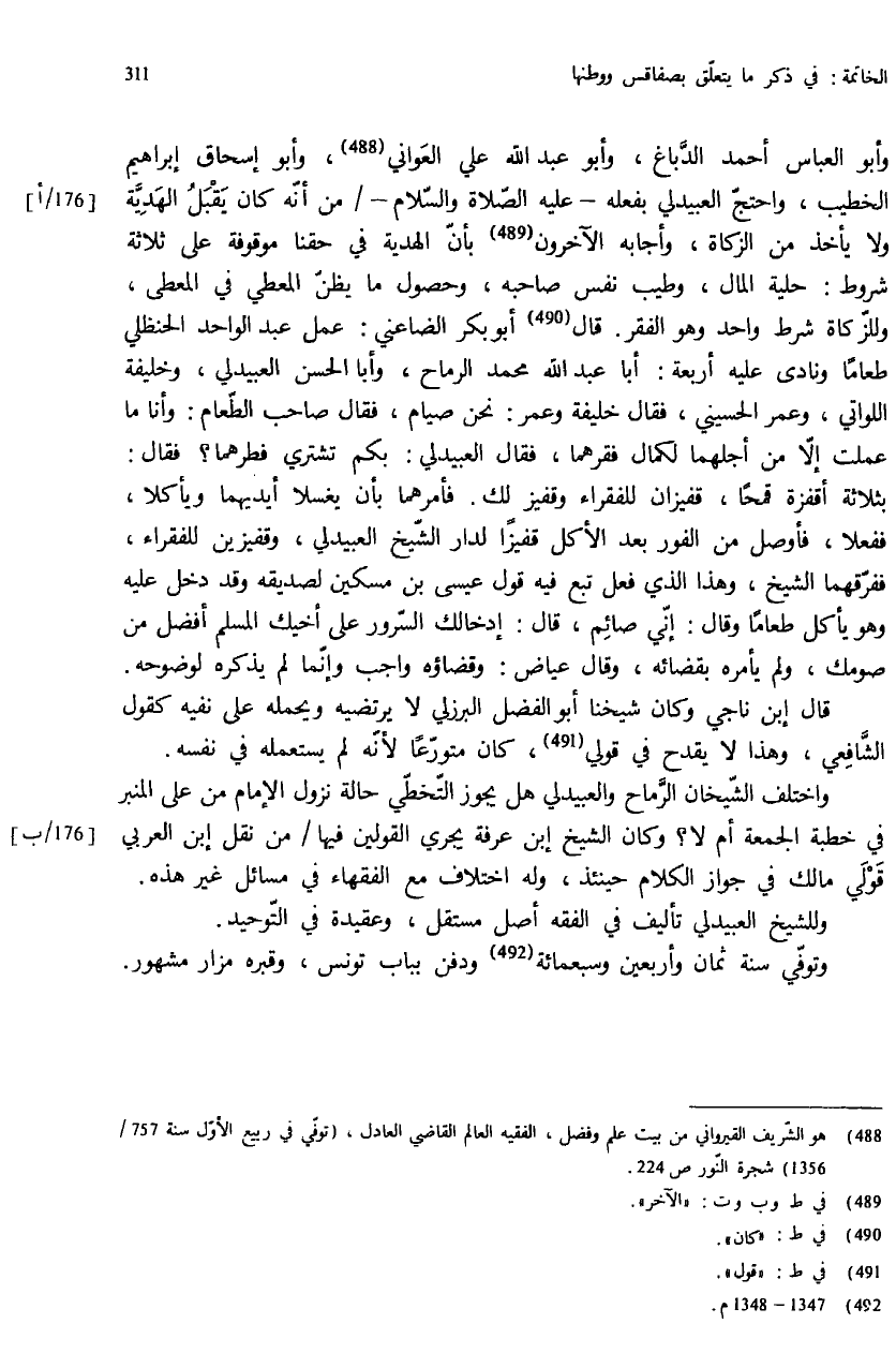 وأبو العباس أحمد الدّباغ، وأبو عبد الله علي العواني (¬488)، وأبو إسحاق إبراهيم الخطيب، واحتجّ العبيدلي بفعله - عليه الصّلاة والسّلام - / من أنّه كان يقبل الهديّة ولا يأخذ من الزكاة، وأجابه الآخرون (¬489) بأنّ الهدية في حقنا موقوفة على ثلاثة شروط: حلية المال، وطيب نفس صاحبه، وحصول ما يظنّ المعطي في المعطى، وللزّكاة شرط واحد وهو الفقر. قال (¬490) أبو بكر الضاعني: عمل عبد الواحد الحنظلي طعاما ونادى عليه أربعة: أبا عبد الله محمد الرماح، وأبا الحسن العبيدلي، وخليفة اللواتي، وعمر الحسيني، فقال خليفة وعمر: نحن صيام، فقال صاحب الطّعام: وأنا ما عملت إلاّ من أجلهما لكمال فقرهما، فقال العبيدلي: بكم تشتري فطرهما؟ فقال: