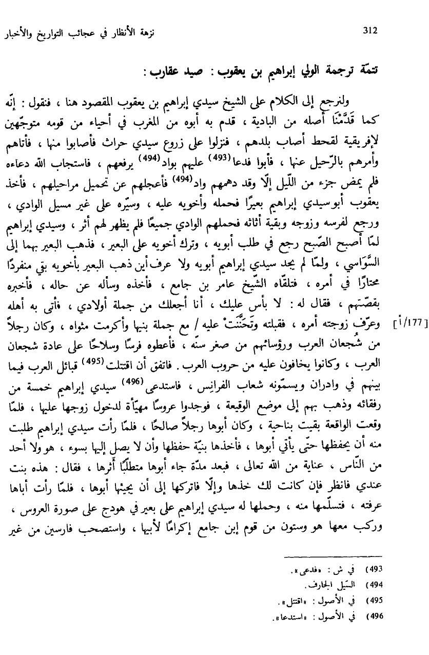 ولنرجع إلى الكلام على الشيخ سيدي إبراهيم بن يعقوب المقصود هنا، فنقول: إنّه كما قدّمنا أصله من البادية، قدم به أبوه من المغرب في أحياء من قومه متوجّهين لإفريقية لقحط أصاب بلدهم، فنزلوا على زروع سيدي حراث فأصابوا منها، فأتاهم وأمرهم بالرّحيل عنها، فأبوا فدعا (¬493) عليهم بواد (494) يرفعهم، فاستجاب الله دعاءه فلم يمض جزء من اللّيل إلاّ وقد دهمهم واد (¬494) فأعجلهم عن تحميل مراحيلهم، فأخذ يعقوب أبو سيدي إبراهيم بعيرا فحمله وأخويه عليه، وسيّره على غير مسيل الوادي، ورجع لفرسه وزوجه وبقية أثاثه فحملهم الوادي جميعا فلم يظهر لهم أثر، وسيدي إبراهيم لمّا أصبح الصّبح رجع في طلب أبويه، وترك أخويه على البعير، فذهب البعير بهما إلى السّواسي، ولمّا لم يجد سيدي إبراهيم أبويه ولا عرف أين ذهب البعير بأخويه بقي منفردا محتارا في أمره، فتلقّاه الشّيخ عامر بن جامع، فأخذه وسأله عن حاله، فأخبره بقصّتهم، فقال له: لا بأس عليك، أنا أجعلك من جملة أولادي، فأتى به أهله وعرّف زوجته أمره، فقبلته وتحنّنت عليه / مع جملة بنيها وأكرمت مثواه، وكان رجلا من شجعان العرب ورؤسائهم من صغر سنّه، فأعطوه فرسا وسلاحا على عادة شجعان العرب، وكانوا يخافون عليه من حروب العرب. فاتفق أن اقتتلت (¬495) قبائل العرب فيما بينهم في وادران ويسمّونه شعاب الفرانس، فاستدعى (¬496) سيدي إبراهيم خمسة من رفقائه وذهب بهم إلى موضع الوقيعة، فوجدوا عروسا مهيّأة لدخول زوجها عليها، فلمّا وقعت الواقعة بقيت بناحية، وكان أبوها رجلا صالحا، فلمّا رأت سيدي إبراهيم طلبت منه أن يحفظها حتّى يأتي أبوها، فأخذها بنيّة حفظها وأن لا يصل إليها بسوء، هو ولا أحد من النّاس، عناية من الله تعالى، فبعد مدّة جاء أبوها متطلّبا أثرها، فقال: هذه بنت عندي فانظر فإن كانت لك خذها وإلاّ فاتركها إلى أن يجيئها أبوها، فلمّا رأت أباها عرفته، فتسلّمها منه، وحملها له سيدي إبراهيم على بعير في هودج على صورة العروس، وركب معها هو وستون من قوم إبن جامع إكراما لأبيها، واستصحب فارسين من غير