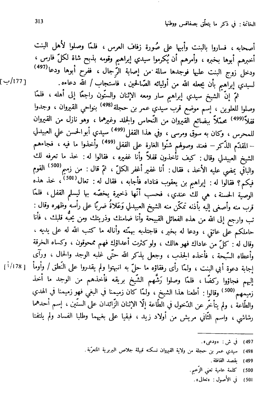 ثمّ إنّ الشيخ سيدي إبراهيم سار ومعه الإثنان والستّون راجعا إلى أهله، فلمّا وصلوا للعلوين، إسم موضع قرب سيدي عمر بن حجلة (¬498) بنواحي القيروان، وجدوا قفلا (499) محمّلا ببضائع القيروان من النّحاس والجلد وغيرهما، وهو نازل من القيروان للمحرس، وكان به سوق ومرسى، وفي هذا القفل (499) سيدي أبو الحسن علي العبيدلي - المقدّم الذّكر - فعند وصولهم شنّوا الغارة على القفل (¬499) وأخذوا ما فيه، فجاءهم الشيخ العبيدلي وقال: كيف تأخذون قفلا وأنا غفيره، فقالوا له: خذ ما تعرفه لك والباقي يمضي عليه الأخذ، فقال: أنا غفير أغفر الكلّ، ثمّ قال: من زميم (¬500) القوم فيكم؟ فقالوا له: إبراهيم بن يعقوب فناداه فأجابه، فقال له: تعال (¬501)، خذ هذه الوصية الحسنة، هي لك عندي، فحسب أنّها ذخيرة يخصّه بها ليسلم القفل، فلمّا قرب منه وأصغى إليه بأذنه تمكّن منه الشيخ العبيدلي وعلاة ضربا على رأسه وظهره وقال: