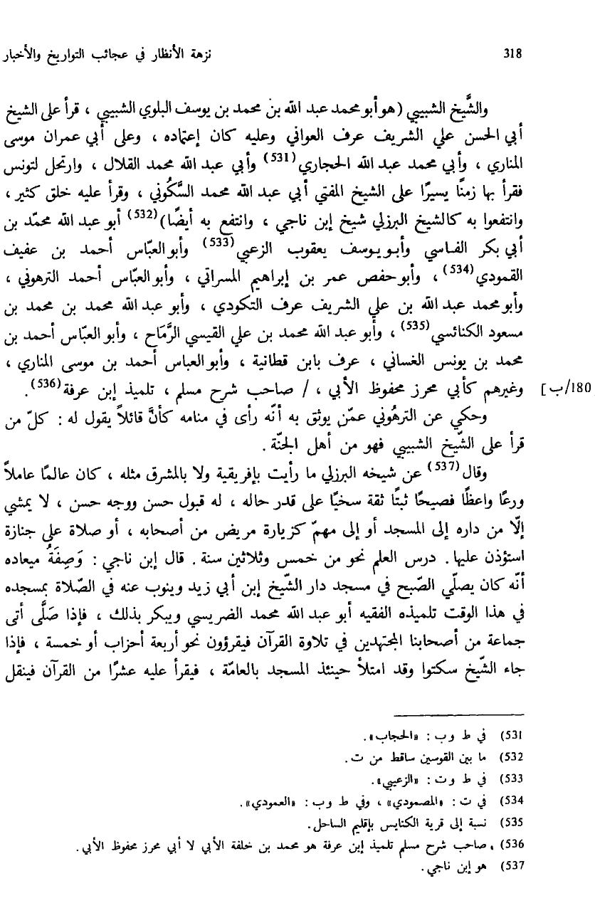 والشّيخ الشبيبي (هو أبو محمد عبد الله بن محمد بن يوسف البلوي الشبيبي، قرأ على الشيخ أبي الحسن علي الشريف عرف العواني وعليه كان إعتماده، وعلى أبي عمران موسى المناري، وأبي محمد عبد الله الحجاري (¬531) وأبي عبد الله محمد القلال، وارتحل لتونس فقرأ بها زمنا يسيرا على الشيخ المفتي أبي عبد الله محمد السّكوني، وقرأ عليه خلق كثير، وانتفعوا به كالشيخ البرزلي شيخ إبن ناجي، وانتفع به أيضا) (¬532) أبو عبد الله محمّد بن أبي بكر الفاسي وأبو يوسف يعقوب الزعبي (¬533) وأبو العبّاس أحمد بن عفيف القمودي (¬534)، وأبو حفص عمر بن إبراهيم المسراتي، وأبو العبّاس أحمد الترهوني، وأبو محمد عبد الله بن علي الشريف عرف التكودي، وأبو عبد الله محمد بن محمد بن مسعود الكنائسي (¬535)، وأبو عبد الله محمد بن علي القيسي الرّماح، وأبو العبّاس أحمد بن محمد بن يونس الغساني، عرف بابن قطانية، وأبو العباس أحمد بن موسى المناري، وغيرهم كأبي محرز محفوظ الأبي، / صاحب شرح مسلم، تلميذ إبن عرفة (¬536).