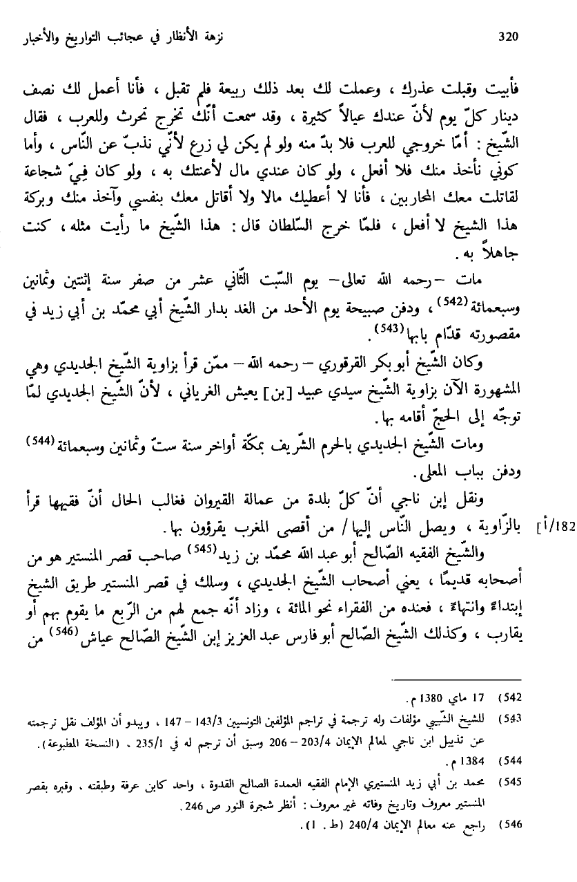 والشّيخ الفقيه الصّالح أبو عبد الله محمّد بن زيد (¬545) صاحب قصر المنستير هو من أصحابه قديما، يعني أصحاب الشّيخ الجديدي، وسلك في قصر المنستير طريق الشيخ إبتداء وانتهاء، فعنده من الفقراء نحو المائة، وزاد أنّه جمع لهم من الرّبع ما يقوم بهم أو يقارب، وكذلك الشّيخ الصّالح أبو فارس عبد العزيز إبن الشّيخ الصّالح عياش (¬546) من
