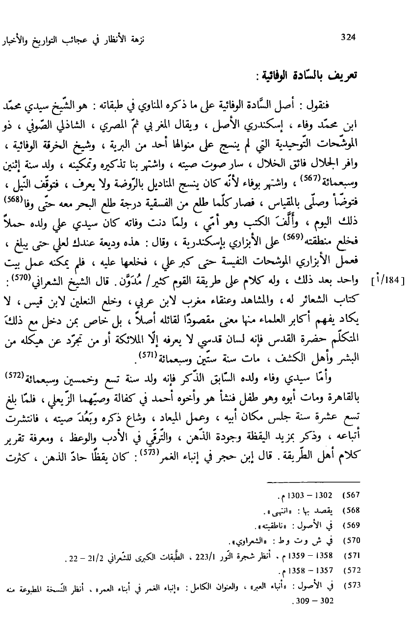 وأمّا سيدي وفاء ولده السّابق الذّكر فإنه ولد سنة تسع وخمسين وسبعمائة (¬572) بالقاهرة ومات أبوه وهو طفل فنشأ هو وأخوه أحمد في كفالة وصيّهما الزّيعلي، فلمّا بلغ تسع عشرة سنة جلس مكان أبيه، وعمل الميعاد، وشاع ذكره وبعد صيته، فانتشرت أتباعه، وذكر بمزيد اليقظة وجودة الذّهن، والتّرقّي في الأدب والوعظ، ومعرفة تقرير كلام أهل الطّريقة. قال إبن حجر في إنباء الغمر (¬573): كان يقظا حادّ الذهن، كثرت