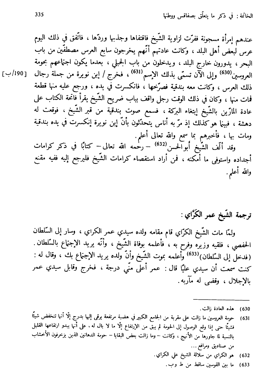 عندهم إمرأة مسجونة ففرّت لزاوية الشّيخ فاقتفاها وجذبها وردّها، فاتّفق في ذلك اليوم عرس لبعض أهل البلد، وكانت عادتهم أنّهم يخرجون سابع العرس مصطفّين من باب البحر، يدورون خارج البلد، ويدخلون من باب الجبلي، بعد ما يكون اجتماعهم بحومة العروسين (¬630) وإلى الآن تسمّى بذلك الإسم (¬631)، فخرج / إبن نويرة من جملة رجال ذلك العرس، وكانت معه بندقية فصرّخها، فانكسرت في يده، ورجع عليه منها قطعة فمات منها، وكان في ذلك الوقت رجل واقف بباب ضريح الشّيخ يقرأ فاتحة الكتاب على عادة المارّين بالشّيخ إبتغاء البركة، فسمع صوت بندقية من قبر الشّيخ، فوقعت له دهشة، فبينما هو كذلك إذ مرّ به أناس يتحدّثون بأنّ إبن نويرة إنكسرت في يده بندقية ومات بها، فأخبرهم بما سمع والله تعالى أعلم.