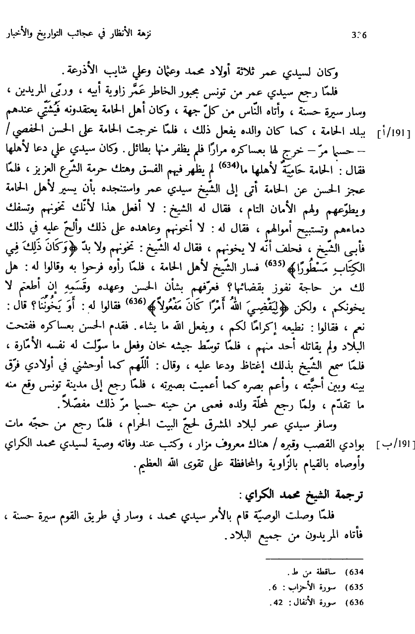فلمّا رجع سيدي عمر من تونس مجبور الخاطر عمّر زاوية أبيه، وربّي المريدين، وسار سيرة حسنة، وأتاه النّاس من كلّ جهة، وكان أهل الحامة يعتقدونه فيشتّي عندهم ببلد الحامة، كما كان والده يفعل ذلك، فلمّا خرجت الحامة على الحسن الحفصي / - حسبما مرّ - خرج لها بعساكره مرارا فلم يظفر منها بطائل. وكان سيدي علي دعا لأهلها فقال: الحامة حامية لأهلها ما (¬634) لم يظهر فيهم الفسق وهتك حرمة الشّرع العزيز، فلمّا عجز الحسن عن الحامة أتى إلى الشّيخ سيدي عمر واستنجده بأن يسير لأهل الحامة ويطوّعهم ولهم الأمان التام، فقال له الشيخ: لا أفعل هذا لأنّك تخونهم وتسفك دماءهم وتستبيح أموالهم، فقال له: لا أخونهم وعاهده على ذلك وألحّ عليه في ذلك فأبى الشّيخ، فحلف أنّه لا يخونهم، فقال له الشّيخ: تخونهم ولا بدّ {كانَ ذلِكَ فِي الْكِتابِ مَسْطُوراً} (¬635) فسار الشّيخ لأهل الحامة، فلمّا رأوه فرحوا به وقالوا له: هل لك من حاجة نفوز بقضائها؟ فعرّفهم بشأن الحسن وعهده وقسمه إن أطعتم لا يخونكم، ولكن {لِيَقْضِيَ اللهُ أَمْراً كانَ مَفْعُولاً} (¬636) فقالوا له: أو يخوننا؟ قال: