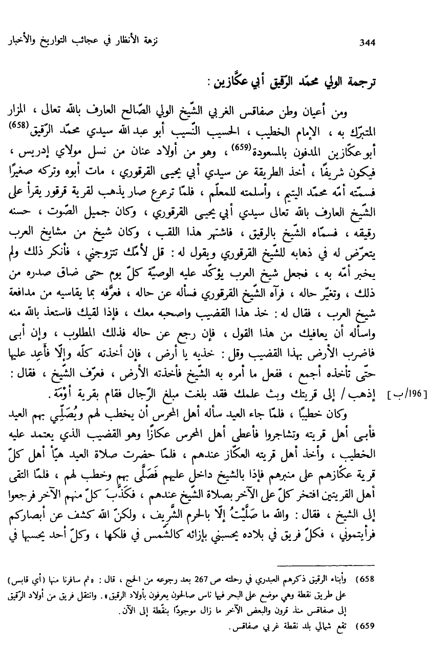 ومن أعيان وطن صفاقس الغربي الشّيخ الولي الصّالح العارف بالله تعالى، المزار المتبرّك به، الإمام الخطيب، الحسيب النّسيب أبو عبد الله سيدي محمّد الرّقيق (¬658) أبو عكّازين المدفون بالمسعودة (¬659)، وهو من أولاد عنان من نسل مولاي إدريس، فيكون شريفا، أخذ الطريقة عن سيدي أبي يحيى القرقوري، مات أبوه وتركه صغيرا فسمّته أمّه محمّد اليتيم، وأسلمته للمعلّم، فلمّا ترعرع صار يذهب لقرية قرقور يقرأ على الشّيخ العارف بالله تعالى سيدي أبي يحيى القرقوري، وكان جميل الصّوت، حسنه رقيقه، فسمّاه الشّيخ بالرقيق، فاشتهر هذا اللقب، وكان شيخ من مشايخ العرب يتعرّض له في ذهابه للشّيخ القرقوري ويقول له: قل لأمّك تتزوجني، فأنكر ذلك ولم يخبر أمّه به، فجعل شيخ العرب يؤكّد عليه الوصيّة كلّ يوم حتى ضاق صدره من ذلك، وتغيّر حاله، فرآه الشّيخ القرقوري فسأله عن حاله، فعرّفه بما يقاسيه من مدافعة شيخ العرب، فقال له: خذ هذا القضيب واصحبه معك، فإذا لقيك فاستعذ بالله منه واسأله أن يعافيك من هذا القول، فإن رجع عن حاله فذلك المطلوب، وإن أبى فاضرب الأرض بهذا القضيب وقل: خذيه يا أرض، فإن أخذته كلّه وإلاّ فأعد عليها حتّى تأخذه أجمع، ففعل ما أمره به الشّيخ فأخذته الأرض، فعرّف الشّيخ، فقال: