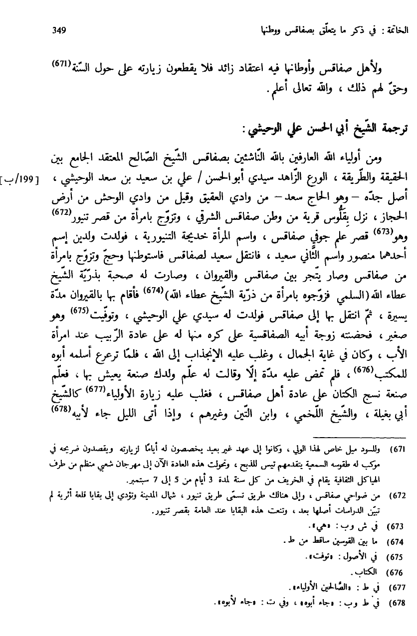 ومن أولياء الله العارفين بالله النّاشئين بصفاقس الشّيخ الصّالح المعتقد الجامع بين الحقيقة والطّريقة، الورع الزّاهد سيدي أبو الحسن / علي بن سعيد بن سعد الوحيشي، أصل جدّه - وهو الحاج سعد - من وادي العقيق وقيل من وادي الوحش من أرض الحجاز، نزل بقلّوس قرية من وطن صفاقس الشرقي، وتزوّج بامرأة من قصر تنيور (¬672) وهو (¬673) قصر علم جوفي صفاقس، واسم المرأة خديجة التنيورية، فولدت ولدين إسم أحدهما منصور واسم الثّاني سعيد، فانتقل سعيد لصفاقس فاستوطنها وحجّ وتزوّج بامرأة من صفاقس وصار يتّجر بين صفاقس والقيروان، وصارت له صحبة بذرّيّة الشّيخ عطاء الله (السلمي فزوّجوه بامرأة من ذرّية الشّيخ عطاء الله) (¬674) فأقام بها بالقيروان مدّة يسيرة، ثمّ انتقل بها إلى صفاقس فولدت له سيدي علي الوحيشي، وتوفّيت (¬675) وهو صغير، فحضنته زوجة أبيه الصفاقسية على كره منها له على عادة الرّبيب عند امرأة الأب، وكان في غاية الجمال، وغلب عليه الإنجذاب إلى الله، فلمّا ترعرع أسلمه أبوه للمكتب (¬676)، فلم تمض عليه مدّة إلاّ وقالت له علّم ولدك صنعة يعيش بها، فعلّم صنعة نسج الكتان على عادة أهل صفاقس، فغلب عليه زيارة الأولياء (¬677) كالشّيخ أبي بغيلة، والشّيخ اللّخمي، وابن التّين وغيرهم، وإذا أتى الليل جاء لأبيه (¬678)