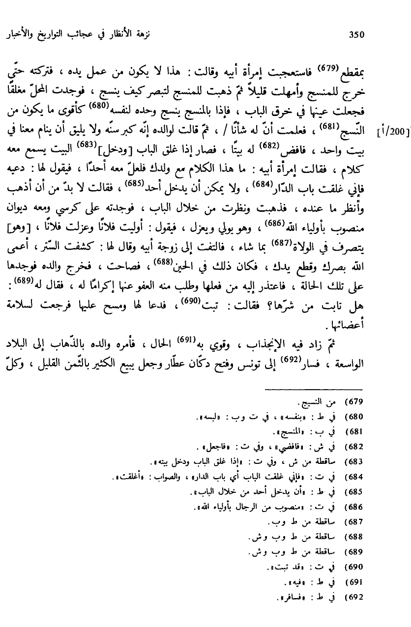 بمقطع (¬679) فاستعجبت إمرأة أبيه وقالت: هذا لا يكون من عمل يده، فتركته حتّى خرج للمنسج وأمهلت قليلا ثمّ ذهبت للمنسج لتبصر كيف ينسج، فوجدت المحلّ مغلقا فجعلت عينها في خرق الباب، فإذا بالمنسج ينسج وحده لنفسه (¬680) كأقوى ما يكون من النّسج (¬681)، فعلمت أنّ له شأنا /، ثمّ قالت لوالده إنّه كبر سنّه ولا يليق أن ينام معنا في بيت واحد، فافض (¬682) له بيتا، فصار إذا غلق الباب [ودخل] (¬683) البيت يسمع معه كلام، فقالت إمرأة أبيه: ما هذا الكلام مع ولدك فلعلّ معه أحدا، فيقول لها: دعيه فإني غلقت باب الدّار (¬684)، ولا يمكن أن يدخل أحد (¬685)، فقالت لا بدّ من أن أذهب وأنظر ما عنده، فذهبت ونظرت من خلال الباب، فوجدته على كرسي ومعه ديوان منصوب بأولياء الله (¬686)، وهو يولي ويعزل، فيقول: أوليت فلانا وعزلت فلانا، [وهو] يتصرف في الولاة (¬687) بما شاء، فالتفت إلى زوجة أبيه وقال لها: كشفت السّتر، أعمى الله بصرك وقطع يدك، فكان ذلك في الحين (¬688)، فصاحت، فخرج والده فوجدها على تلك الحالة، فاعتذر إليه من فعلها وطلب منه العفو عنها إكراما له، فقال له (¬689):