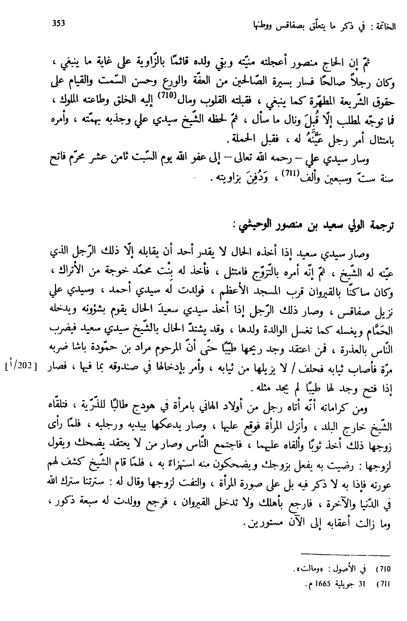 وصار سيدي سعيد إذا أخذه الحال لا يقدر أحد أن يقابله إلاّ ذلك الرّجل الذي عيّنه له الشّيخ، ثمّ إنّه أمره بالتّزوّج فامتثل، فأخذ له بنت محمّد خوجة من الأتراك، وكان ساكنا بالقيروان قرب المسجد الأعظم، فولدت له سيدي أحمد، وسيدي علي نزيل صفاقس، وصار ذلك الرّجل إذا أخذ سيدي سعيد الحال يقوم بشؤونه ويدخله الحمّام ويغسله كما تغسل الوالدة ولدها، وقد يشتدّ الحال بالشّيخ سيدي سعيد فيضرب النّاس بالعذرة، فمن اعتقد وجد ريحها طيّبا حتّى أنّ المرحوم مراد بن حمّودة باشا ضربه مرّة فأصاب ثيابه فحلف / لا يزيلها من ثيابه، وأمر بإدخالها في صندوقه بما فيها، فصار إذا فتح وجد لها طيبا لم يجد مثله.