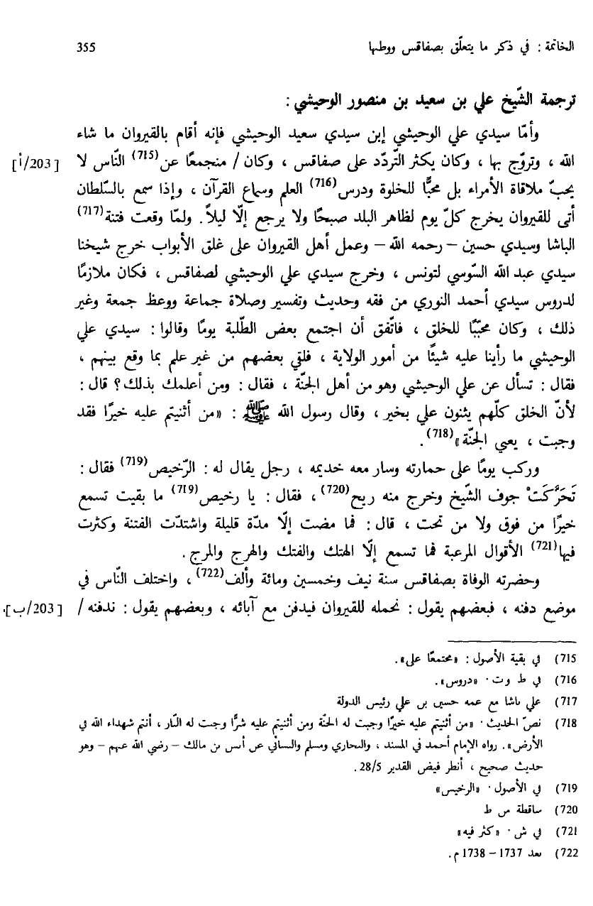 وأمّا سيدي علي الوحيشي إبن سيدي سعيد الوحيشي فإنه أقام بالقيروان ما شاء الله، وتروّج بها، وكان يكثر التّردّد على صفاقس، وكان / منجمعا عن (¬715) النّاس لا يحبّ ملاقاة الأمراء بل محبّا للخلوة ودرس (¬716) العلم وسماع القرآن، وإذا سمع بالسّلطان أتى للقيروان يخرج كلّ يوم لظاهر البلد صبحا ولا يرجع إلاّ ليلا. ولمّا وقعت فتنة (¬717) الباشا وسيدي حسين - رحمه الله - وعمل أهل القيروان على غلق الأبواب خرج شيخنا سيدي عبد الله السّوسي لتونس، وخرج سيدي علي الوحيشي لصفاقس، فكان ملازما لدروس سيدي أحمد النوري من فقه وحديث وتفسير وصلاة جماعة ووعظ جمعة وغير ذلك، وكان محبّبا للخلق، فاتّفق أن اجتمع بعض الطّلبة يوما وقالوا: سيدي علي الوحيشي ما رأينا عليه شيئا من أمور الولاية، فلقي بعضهم من غير علم بما وقع بينهم، فقال: تسأل عن علي الوحيشي وهو من أهل الجنّة، فقال: ومن أعلمك بذلك؟ قال: