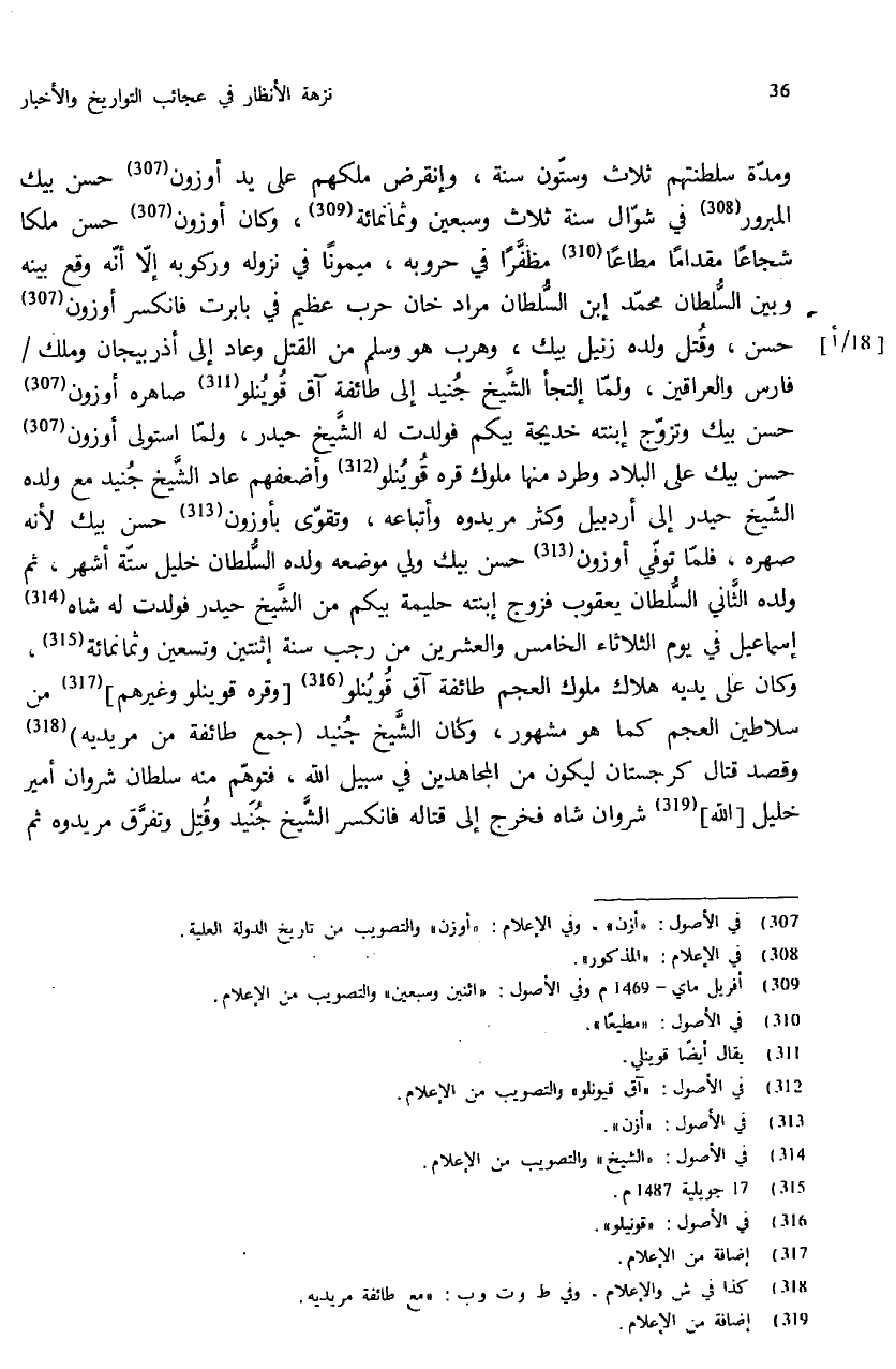 ومدّة سلطنتهم ثلاث وستّون سنة، وإنقرض ملكهم على يد أوزون (¬307) حسن بيك المبرور (¬308) في شوّال سنة ثلاث وسبعين وثمانمائة (¬309)، وكان أوزون (307) حسن ملكا شجاعا مقداما مطاعا (¬310) مظفّرا في حروبه، ميمونا في نزوله وركوبه إلاّ أنّه وقع بينه وبين السّلطان محمّد إبن السّلطان مراد خان حرب عظيم في بابرت فانكسر أوزون (307) حسن، وقتل ولده زنيل بيك، وهرب هو وسلم من القتل وعاد إلى أذربيجان وملك / فارس والعراقين، ولمّا إلتجأ الشّيخ جنيد إلى طائفة آق قوينلو (¬311) صاهره أوزون (307) حسن بيك وتزوّج إبنته خديجة بيكم فولدت له الشّيخ حيدر، ولمّا استولى أوزون (307) حسن بيك على البلاد وطرد منها ملوك قره قوينلو (¬312) وأضعفهم عاد الشّيخ جنيد مع ولده الشّيخ حيدر إلى أردبيل وكثر مريدوه وأتباعه، وتقوّى بأوزون (¬313) حسن بيك لأنه صهره، فلمّا توفّي أوزون (313) حسن بيك ولي موضعه ولده السّلطان خليل ستّة أشهر، ثم ولده الثّاني السّلطان يعقوب فزوج إبنته حليمة بيكم من الشّيخ حيدر فولدت له شاه (¬314) إسماعيل في يوم الثلاثاء الخامس والعشرين من رجب سنة إثنتين وتسعين وثمانمائة (¬315)، وكان على يديه هلاك ملوك العجم طائفة آق قوينلو (¬316) [وقره قوينلو وغيرهم] (¬317) من سلاطين العجم كما هو مشهور، وكان الشّيخ جنيد (جمع طائفة من مريديه) (¬318) وقصد قتال كرجستان ليكون من المجاهدين في سبيل الله، فتوهّم منه سلطان شروان أمير خليل [الله] (¬319) شروان شاه فخرج إلى قتاله فانكسر الشّيخ جنيد وقتل وتفرّق مريدوه ثم