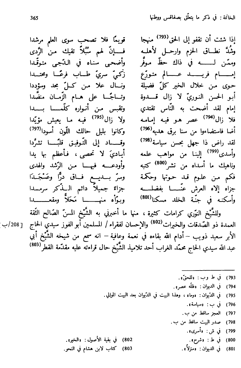 وللشّيخ النّوري كرامات كثيرة، منها ما أخبرني به الشّيخ المسنّ الصّالح الثّقة العمدة ذو الصّدقات والخيرات (¬802) والإحسان لفقراء / المسلمين أبو الفوز سيدي الحاج الأبر سعيد ذويب - أدام الله بقاءه في نعمة وعافية - انه سمع من شيخه الشّيخ أبي عبد الله سيدي الحاج محمّد الغراب أحد تلاميذ الشّيخ حال قراءته عليه مقدّمة القطر (¬803)
