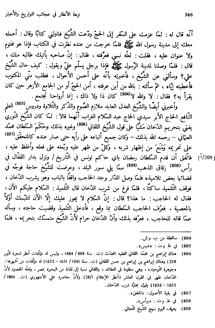 (¬806) هناك إبراهيم بن محمّد اللقاني الفقيه المحدّث (ت. سنة 889/ 1484، وليس له مؤلّفات أنظر شجرة النّور 258) وهناك إبراهيم بن إبراهيم بن حسن اللقاني (ت. سنة 1041/ 1631 - 1632) له مؤلّفات من أشهرها: «جوهرة التّوحيد»، وهي منظومة في العقائد، واللقاني نسبة إلى لقانة من البحيرة بمصر، ولعلّه المقصود لأنّ الدّخان ظهر في القرن العاشر (أنظر الإعلام 1/ 28) ولأنّ معاصره علي الأجهوري (ت.1066/ 1655 - 1656) يقول بحلية شرب الدّخان.