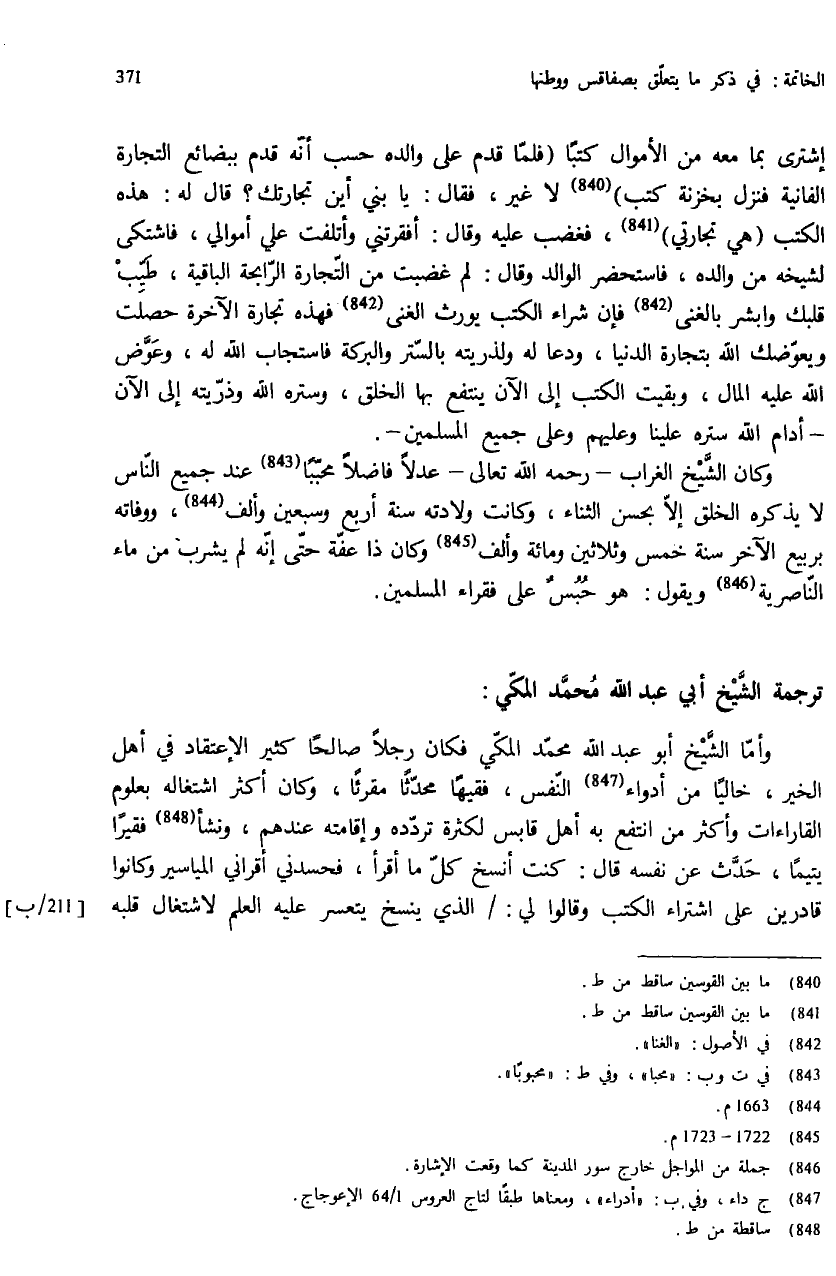 إشترى بما معه من الأموال كتبا (فلمّا قدم على والده حسب أنّه قدم ببضائع التجارة الفانية فنزل بخزنة كتب) (¬840) لا غير، فقال: يا بني أين تجارتك؟ قال له: هذه الكتب (هي تجارتي) (¬841)، فغضب عليه وقال: أفقرتني وأتلفت علي أموالي، فاشتكى لشيخه من والده، فاستحضر الوالد وقال: لم غضبت من التّجارة الرّابحة الباقية، طيّب قلبك وابشر بالغنى (842) فإن شراء الكتب يورث الغنى (¬842) فهذه تجارة الآخرة حصلت ويعوّضك الله بتجارة الدنيا، ودعا له ولذريته بالسّتر والبركة فاستجاب الله له، وعوّض الله عليه المال، وبقيت الكتب إلى الآن ينتفع بها الخلق، وستره الله وذرّيته إلى الآن - أدام الله ستره علينا وعليهم وعلى جميع المسلمين -.