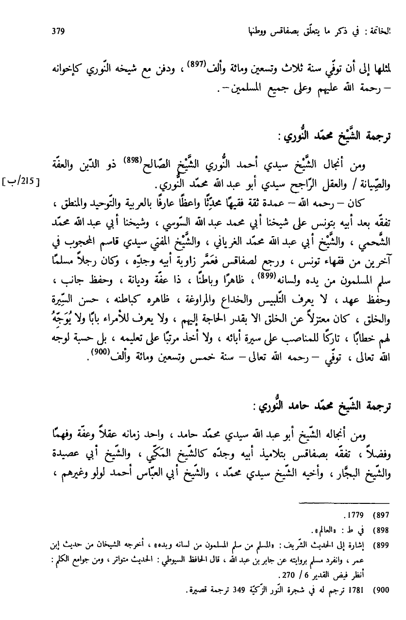 ومن أنجال الشّيخ سيدي أحمد النّوري الشّيخ الصّالح (¬898) ذو الدّين والعفّة والصّيانة / والعقل الرّاجح سيدي أبو عبد الله محمّد النّوري.